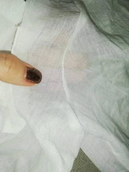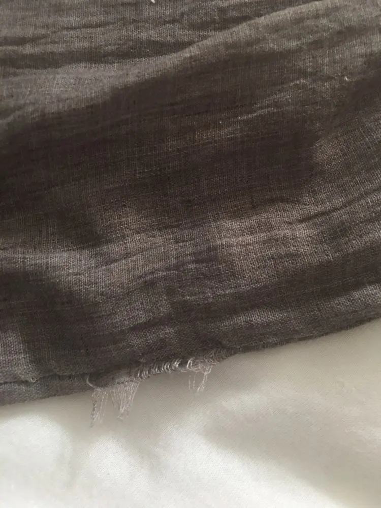 Очень тонкая ткань, прозрачная. Написано лён, на нисколько не лён. В описании имеют в виду "материал похож на лён внешне". Возможно хлопок, но точно с примесью синтетики, т.к. электризуется. Этикетки с составом нет, понять состав невозможно