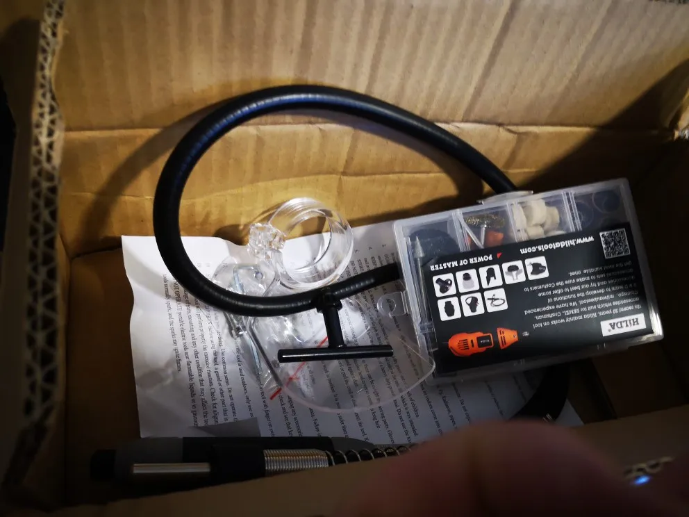 Доставка супер быстрая до двери,всего три дня.Брал с сумкой чтобы было куда сложить.Комплектация насадок очень скудная надо брать отдельно,в работе не пробывал но покупкой доволен.Коробка помята ,крышка наконечнека сломана это минус.