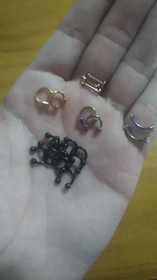 Быстрая доставка, все подошло хорошо упаковано, но, если что-то не так, я должен был попросить поместить все в одну упаковку, потому что внутри было много небольших пакетов. Я купил 6 мм версии и они крошечные (прилагаются фотографии для сравнения [у меня есть большие руки]). Этот размер, вероятно, будет работать только если вы хотите положить его в ухо, скорее всего, вам не подойдет, если вы хотите положить в губы, и он будет в основном скрыт, если вы положите в середину носа (получите 8 мм для губ и 10 мм для носа вместо этого)