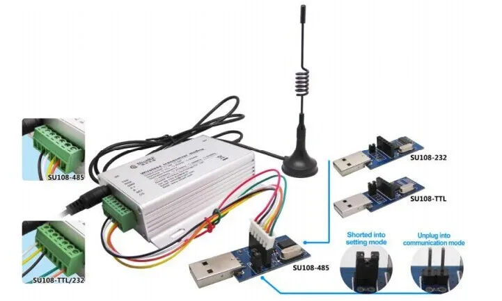 USB-мост полезен для клиентов, чтобы настроить параметры и просто провести тест связи с ПК. Есть 3 типа USB-мостов: SU108-TTL, SU108-232, SU108 - 485. SU108 -TTL для интерфейса TTL, SU108-232 для интерфейса 232, SU108 - 485 для интерфейса 485: