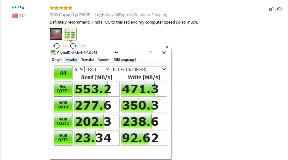 Посылка шла 53 дня. Windows 10 показывает 238Гб. Фактическая скорость записи большого файла 370Мб/с. "Быстрый буфер" имеет объем около 27Гб (это та область, характеристики которой продавцы указывают, как характеристики диска). У многих SSD это значение равно 8Гб. Реальная скорость записи в ячейки памяти после переполнения буфера=65Мб/с (для сравнения многие HDD держат 100, но на протяжении записи с начала файла). На фоне остальных SSD очень неплохие показатели. Продавец вменяемый. Товар хороший. Рекомендую.