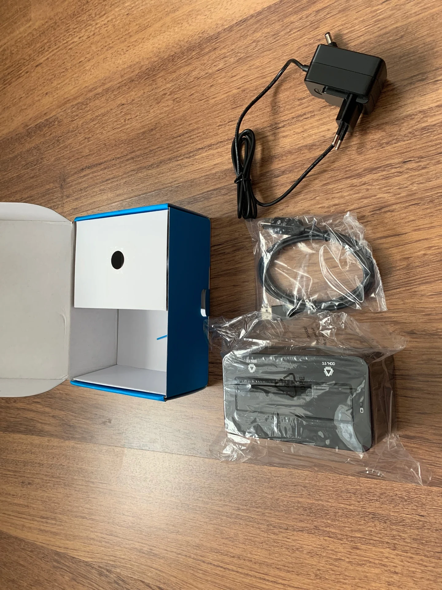 бокс выполнен из качественного чёрного пластика. в комплекте длинный кабель usb, тяжёлый блок питания и диск с мануалом. подключается и работает очень быстро.