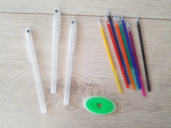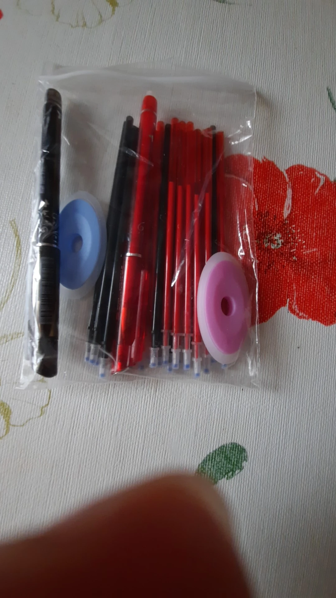 Набор соответствует описанию продавца на сайте. Милая резинка, под цвет стержням. Цвет пасты яркий и острый наконечник, может быть поэтому немного остаются следы после стирания написанного. Если писать без нажима, очень легко, то стирается хорошо. Спасибо продавцу за заказ, теперь я как учитель смогу исправить свои комментарии для учеников.