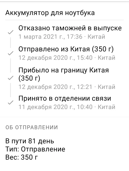 Я так и не получил этот аккумулятор! Заказ был оформлен в конце ноября, до 12 декабря о нем не было никакой информации, трек не отслеживался. Потом, 12 декабря он единожды появился в системе и пропал. У меня была подобная ситуация с другим заказом у другого продавца. Тот сразу же после моего обращения сказал, что таможня не выпустила товар, и через спор тут же вернул деньги. Этот же продавец почти три месяца изворачивался, откладывал срок защиты, врал, что заказ в пути и я обязательно его получу, предлагал вернуть деньги, совершенно неудобными для меня путями, но только не через спор! В итоге вчера наконец-то появилась информация в системе, что китайская таможня не выпустила аккумулятор! В общем, не советую данного продавца. Если вам вдруг придет некачественный товар, я больше, чем уверен, что замучаетесь доказывать свою правоту!