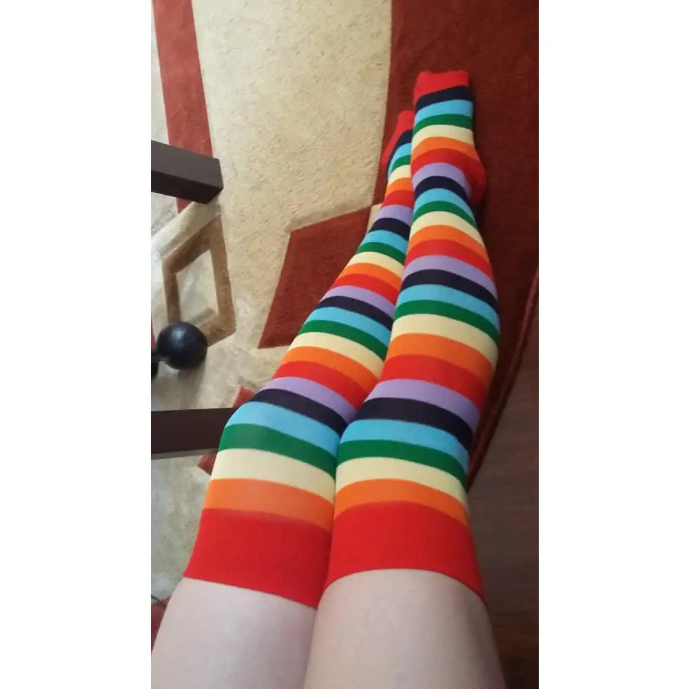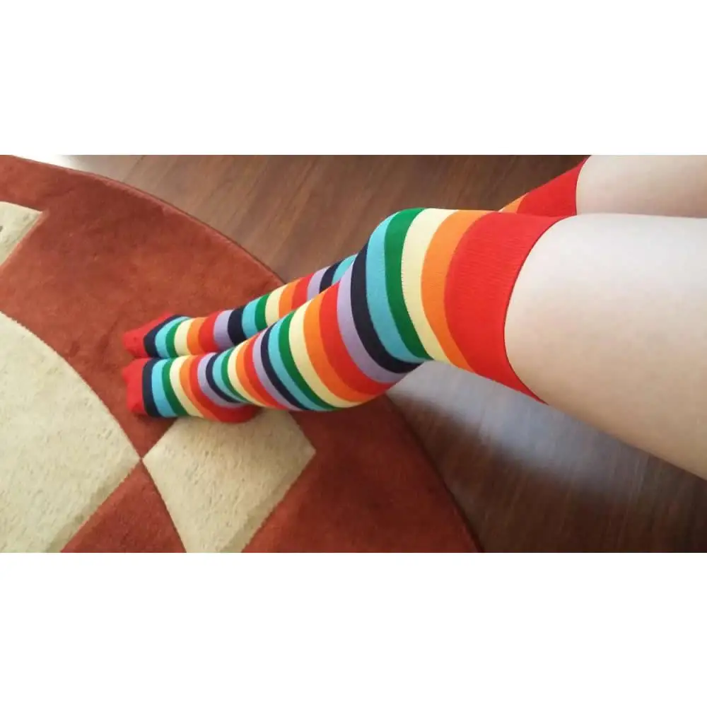 Новинка, модные радужные чулки в полоску, женские чулки до бедра, нейлоновые длинные чулки выше колена, колготки обтягивающие