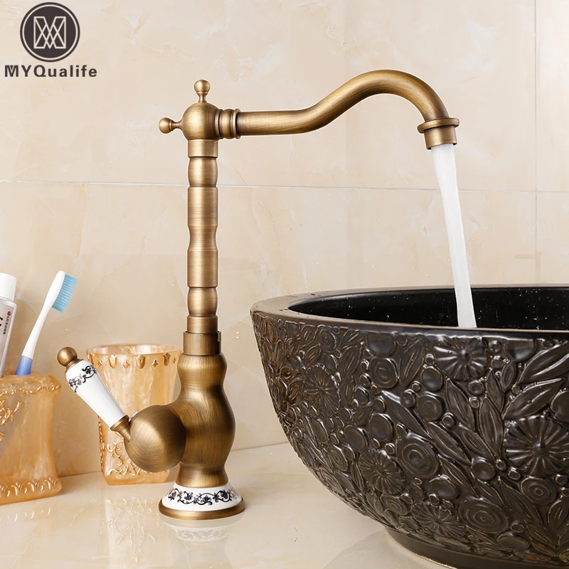 Античный латунный Смеситель для ванной и кухни, крепление на раковину, кран для горячей и холодной воды, с голубой и белой фарфоровой ручкой