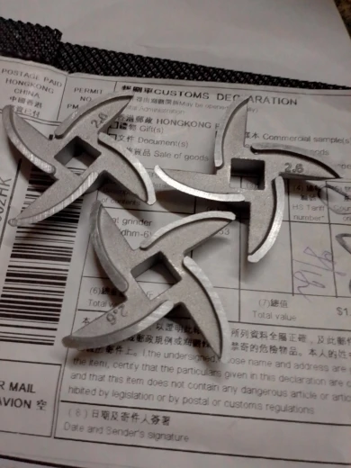 Пришло в срок, но в дороге ножи видимо терлись и стукались друг об друга, появились царапины. Есть вопрос к качеству металла, по ощущениям ножи то ли не закалены, то ли вообще из железа низкого качества и к закалке в принципе не пригодны, боюсь, что заточка быстро сойдет. Дома уже есть набор из купленных в разное время ножей для мясорубки разных форм и эти на вид и на ощупь самые мягкие.