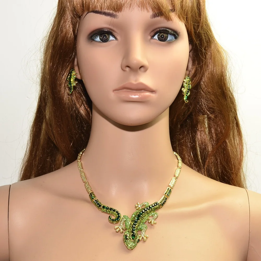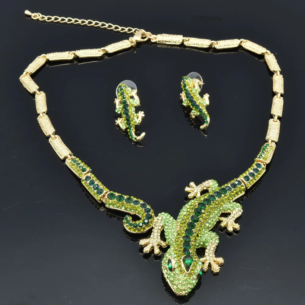 Женский комплект украшений Gecko Lizard, классический набор сережек и ожерелья с кристаллами, сплав и зеленые стразы, FA3274