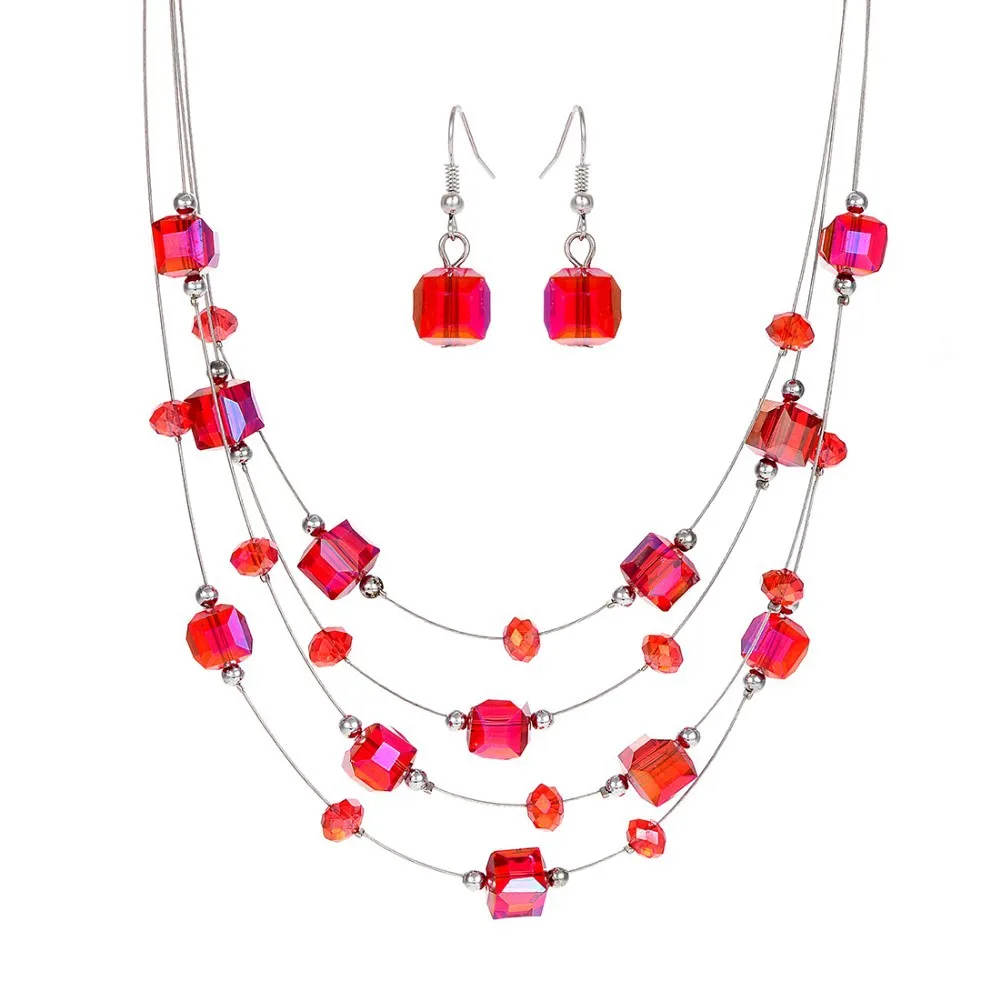 Новый продукт ярко-розовые хрустальные кубические бусины посеребренные многослойные ожерелья Ювелирные наборы для женщин модные ювелирные изделия оптом