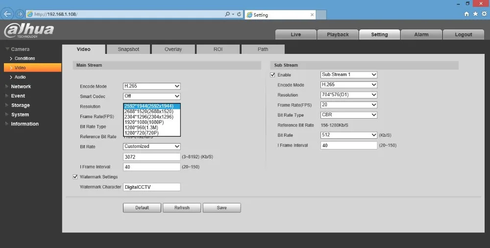 Основной поток: 2592 × 1944 @ 1-20 кадров в секунду2688 × 1520 @ 1-25/30 кадров в секундуПодпоток: 704 × 576 @ 1-25 кадров в секунду/704 × 480 @ 1-30 кадров в секундуТретий поток: 1280 × 720 @ 1-25/30 кадров в секунду