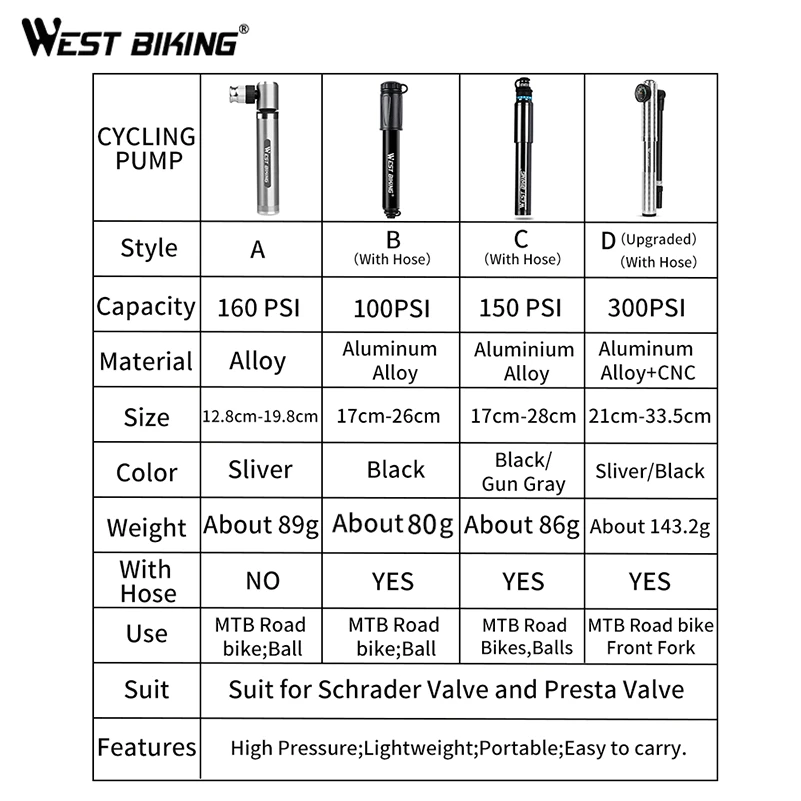 Портативный велосипедный мини-насос WEST BIKING 89G, насос для горного велосипеда 160 PSI, ручной велосипедный насос высокого давления, насос для накачки шин с мячиками