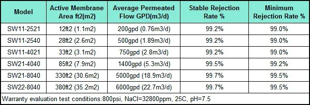 SW4040LE мембрана для морской воды является ароматическим полиамидным композитным мембранным элементом. Применяется для опреснения морской воды. Оптимизируя структуру мембранного элемента, SW4040LE увеличивает пронизывающий поток и требует меньшего количества элементов для того же проницаемого потока. Он характеризуется низким рабочим давлением, низкой инвентаризацией оборудования, отличной скоростью отторжения и надежной производительностью, И его высокий отказ от соли может обеспечить производство питьевой воды из морской воды просто через один-pass RO дизайн.