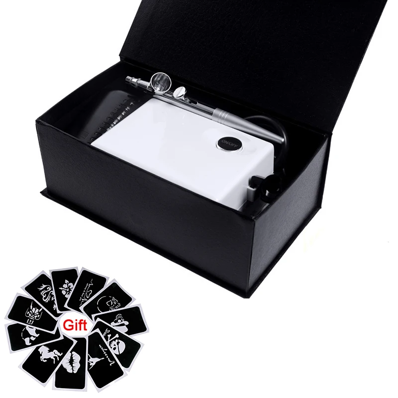 Этот воздушный компрессор постоянного тока подходит для макияжа, косметики, тату и новичков хобби. В наличии много аксессуаров. От самого простого компрессора-airbrush kit до роскошного полного комплекта на ваш выбор.
