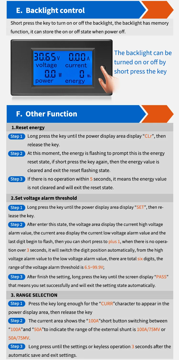 Короткое нажатие кнопки для включения или выключения подсветки, подсветка имеет функцию памяти, она может хранить ВКЛ или ВЫКЛ, когда выключено питание.