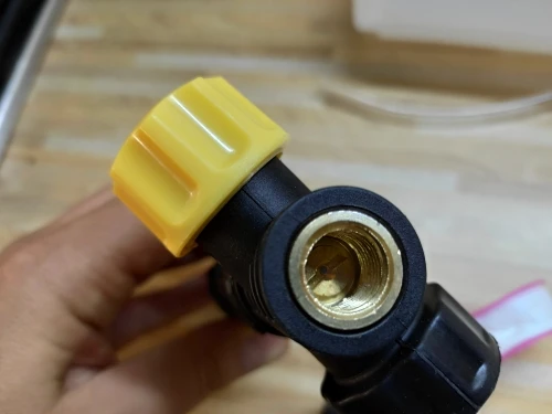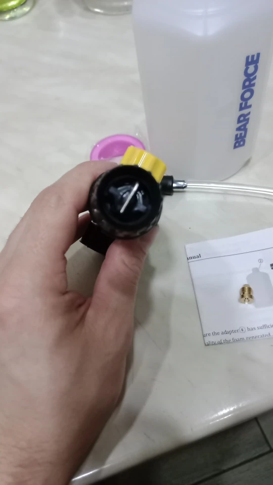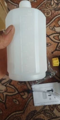 Пенит хорошо. Брал для BLACK & DEKER переходник (Е) подошёл отлично. Разметка на бутылке до 0,5 л, под верх будет 0,6л. Для мойки одного автомобиля достаточно половины. Немного болтается металическая основа в корпусе, там куда закручивается переходник.