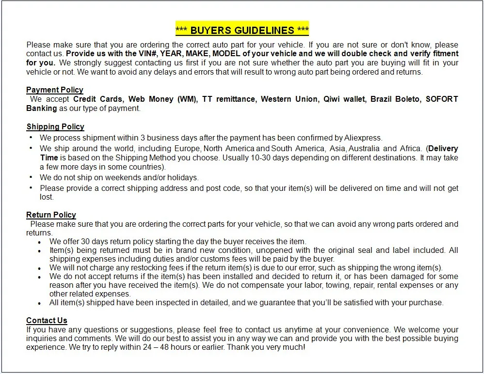 О: если вы покупаете более одного товара, пожалуйста, положите все товары в корзину и посмотрите общую перевозку. Или вы можете спросить меня, отправив мне все Номера OE или названия продукта, количество заказа и пункт назначения с подробным адресом, чтобы я мог суммировать вес брутто и сказать вамВсегоДоставка в различные страны.