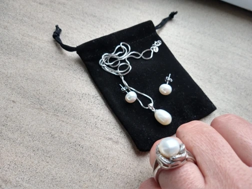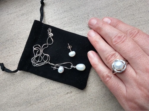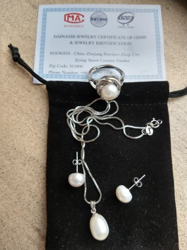 Получил до времени. Я купил этот комплект плюс кольцо, которое появляется на прилагаемых фотографиях. Регулируемое кольцо очень красивое и очень изысканное и элегантное. Жемчужины настоящие, они жемчужины из пресноводной муссы. Вы можете сообщить контакт с зубами. Я надеюсь, что серебро 925 пробы также настоящее, а не просто покрытие и не уродливые. Я буду осторожны, чтобы не намочить его и позаботиться об этом прилагаемым продавцом сертификатом подлинности жемчуга. Рядом с драгоценными камнями поставляются бархатные сумки и замша, чтобы очистить драгоценности. Если драгоценности не будут уродливые, я буду покупать больше в других цветах.