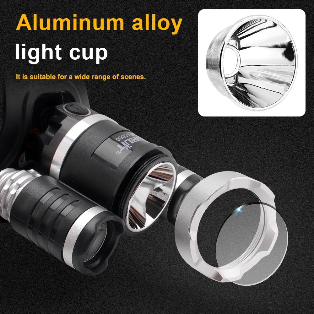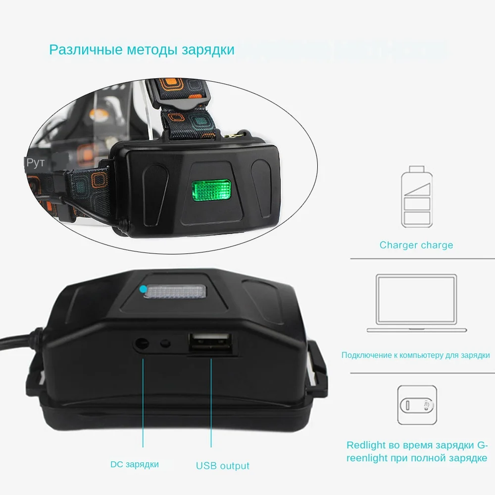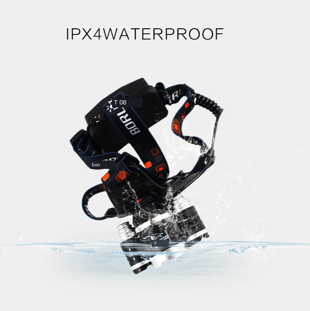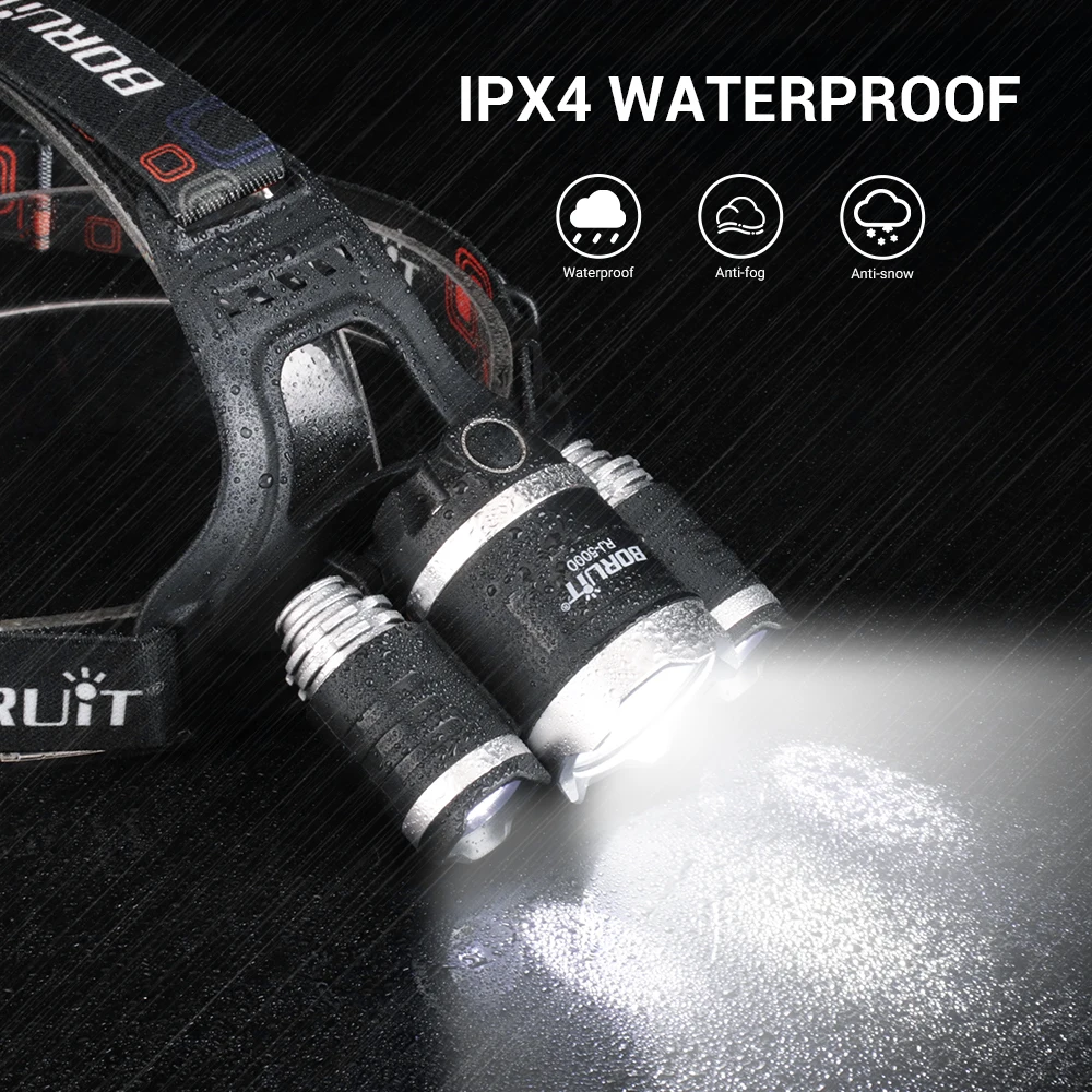 BORUiT RJ-5000 XM-L2 + 2 * R2 светодиодный налобный фонарь 8000лм 4 режима Водонепроницаемый налобный фонарь Перезаряжаемый 18650 Внешний аккумулятор Головной фонарь для кемпинга