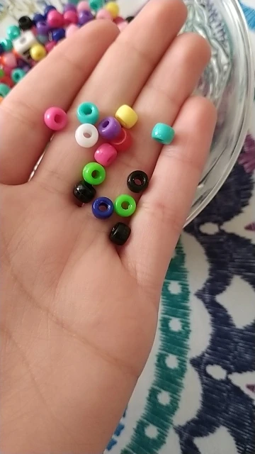 Б2син много, считать не стала. Дырочки достаточно крупные, это здорово. Брала для детей, чтобы составляли себе бусы и браслеты сами