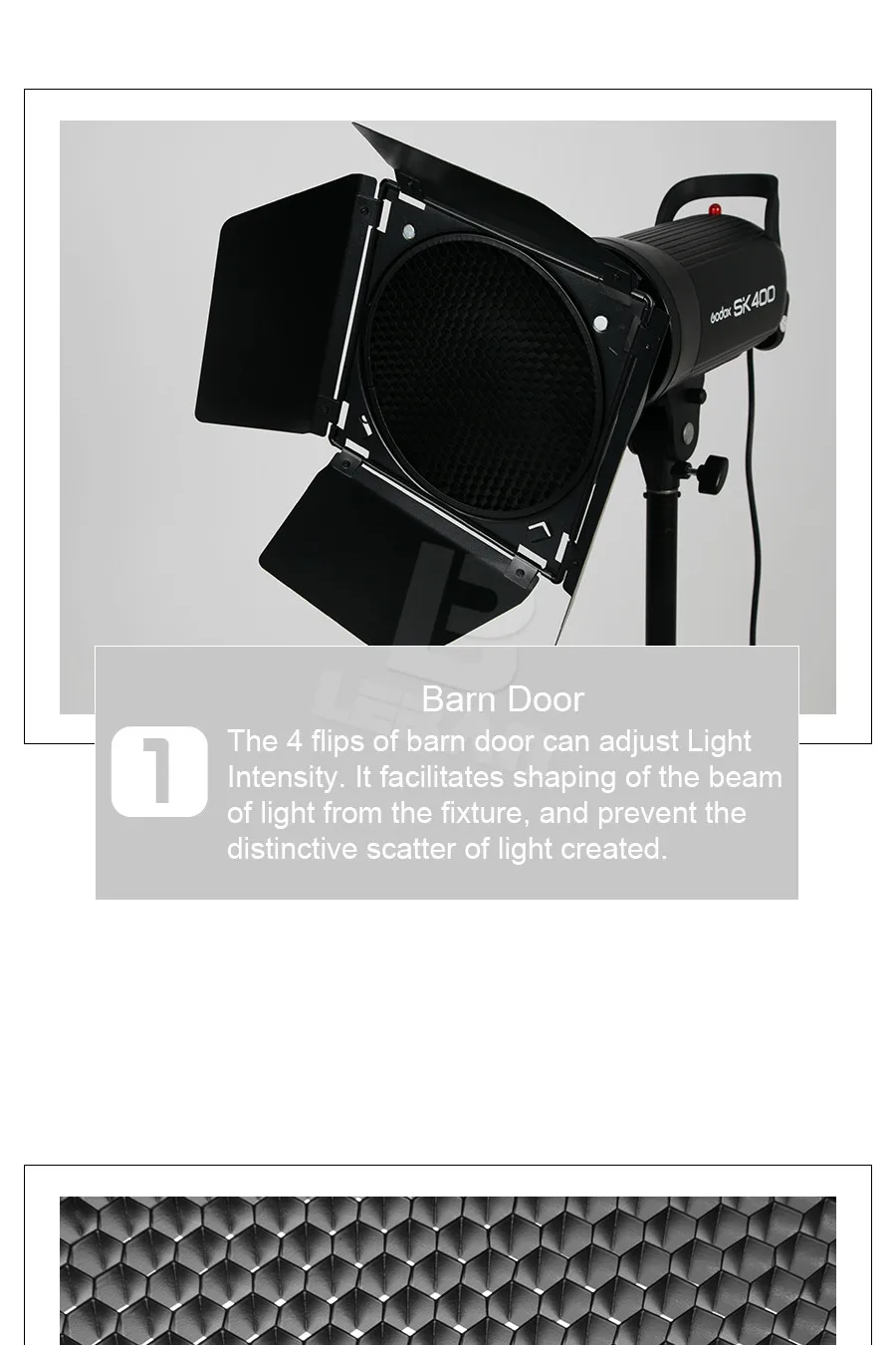 Эта дверь сарая закреплена на стандартном отражателе. Флаги 4 шт. регулируются для гибкого освещения. Светильник может быть сконцентрирован при необходимости. Он также упакован с 4 фильтрами. Используйте фильтры для съемки в различных условиях.