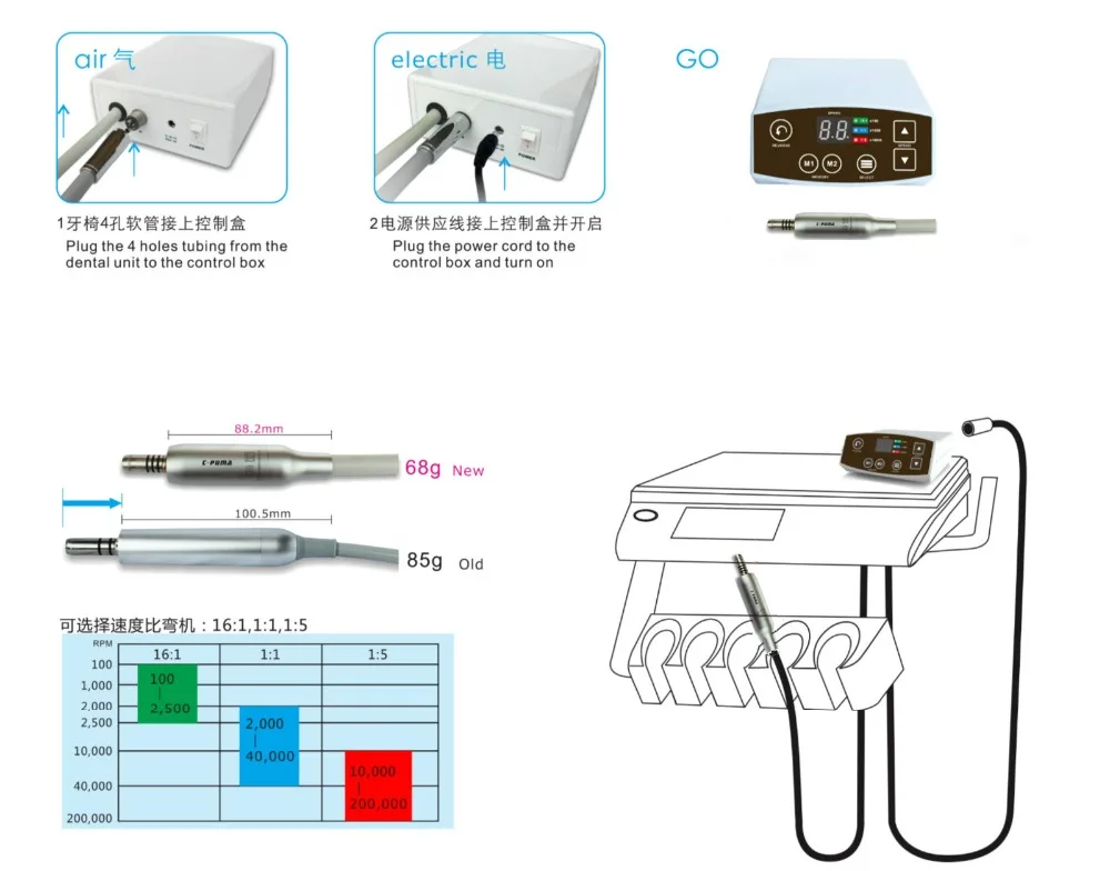 * ISO Тип E легко подключается к двигателям (NSK, KaVo®, Sirona®, W & H®, Bien-Air®)
