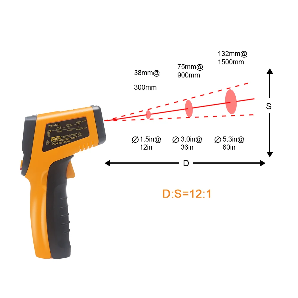 При использовании обратите внимание на расстояние до размера пятна, так как расстояние (D) до поверхности объекта увеличивается, размер пятна (S) из эреа, измеряемая с помощью единицы измерения, становится больше.