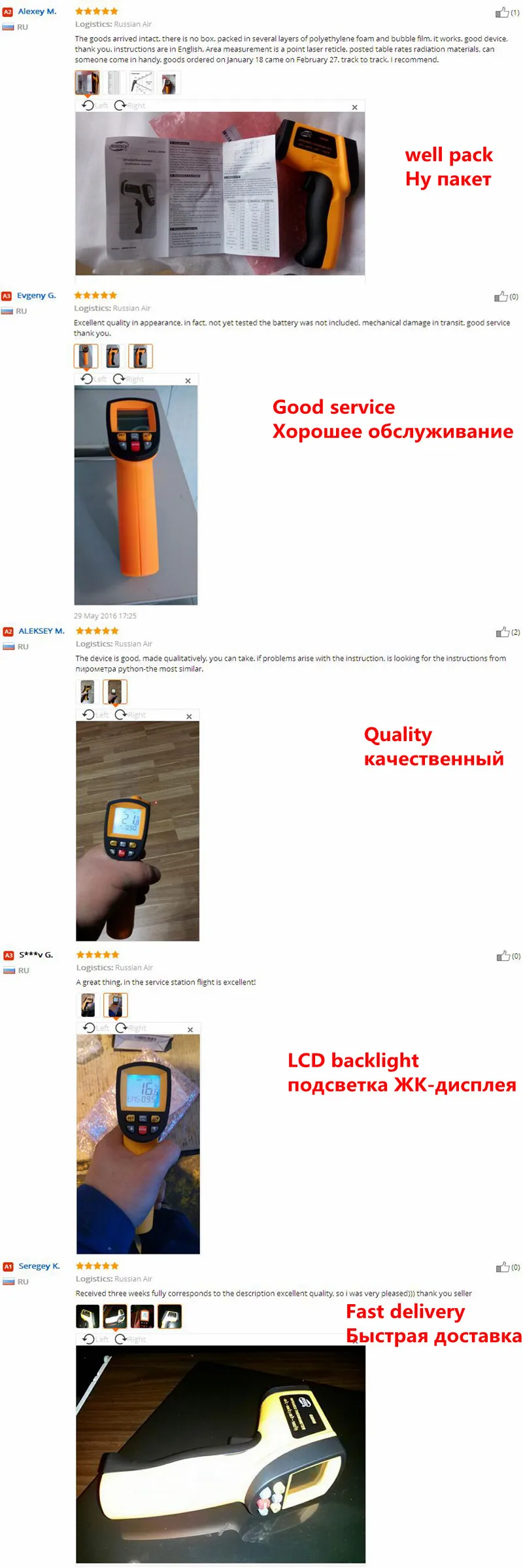 Источник питания:2*1,5 V AAA батареи (не прилагаются)1x9V Батарея (-50 ~ 950 ℃, не прилагаются)