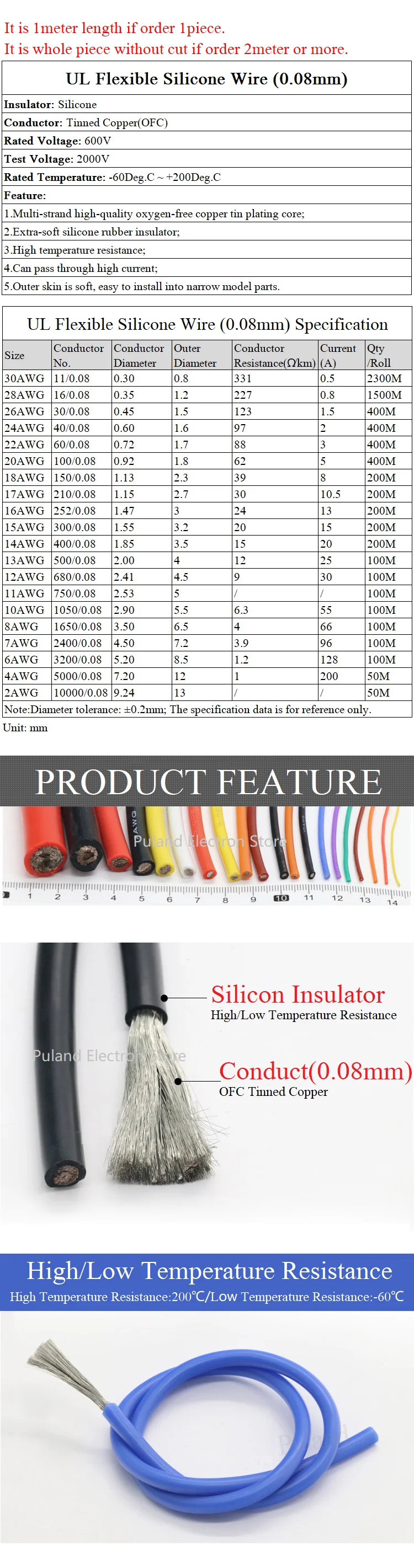 Термостойкий кабель 5 м 30 28 26 24 22 20 18 16 15 14 13 12 10 AWG ...
