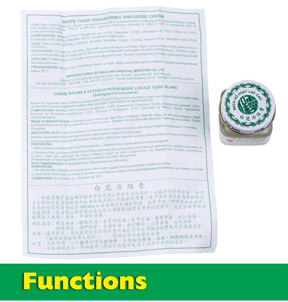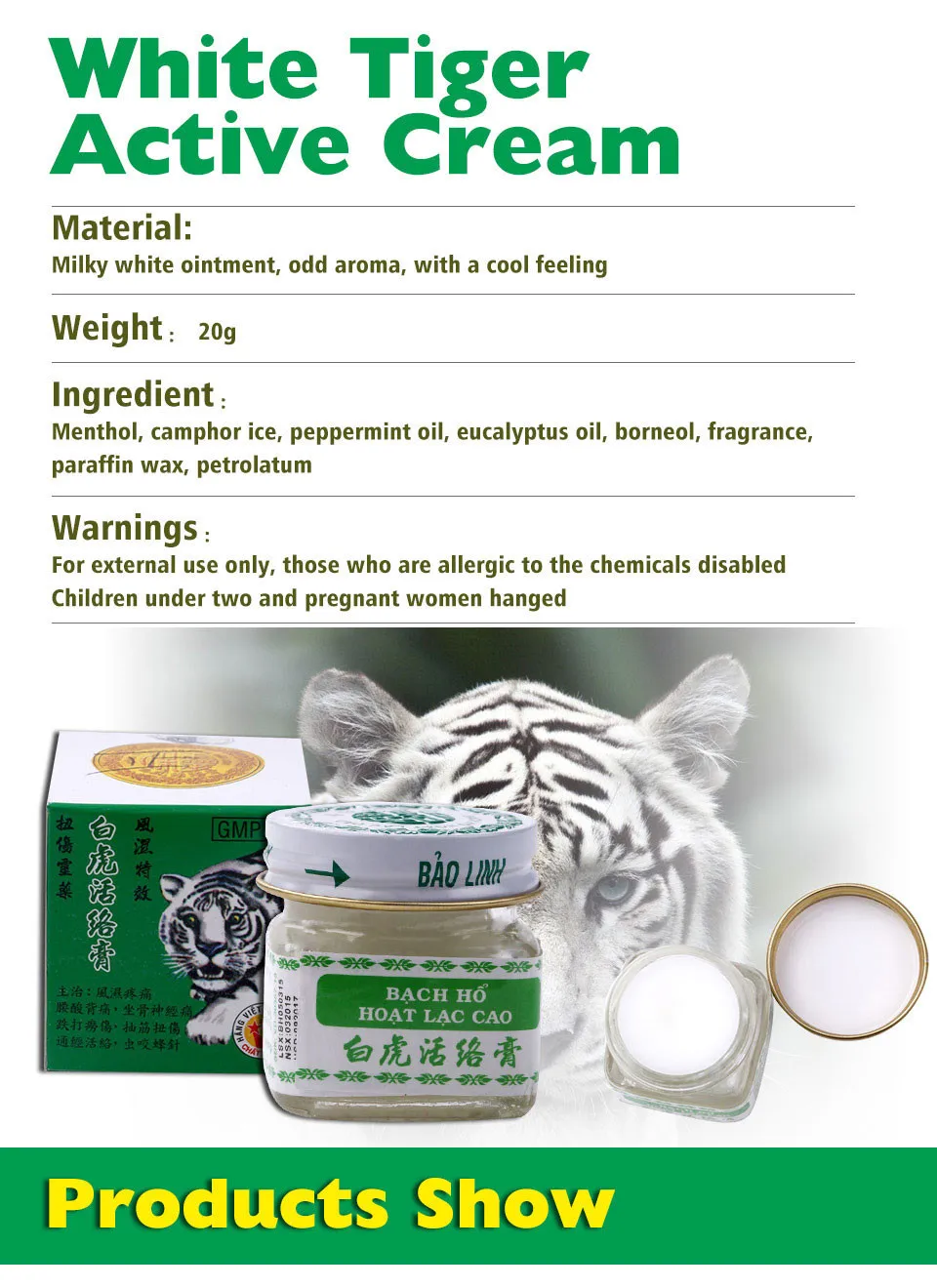 Головная боль:Активный крем с белым тигром, нанесенный по бокам дужки головы, может прекратиться головная боль.