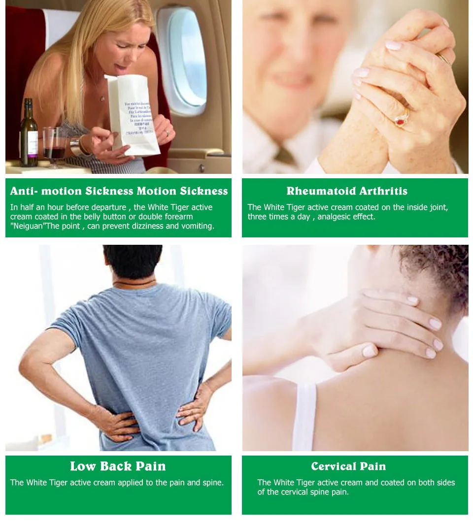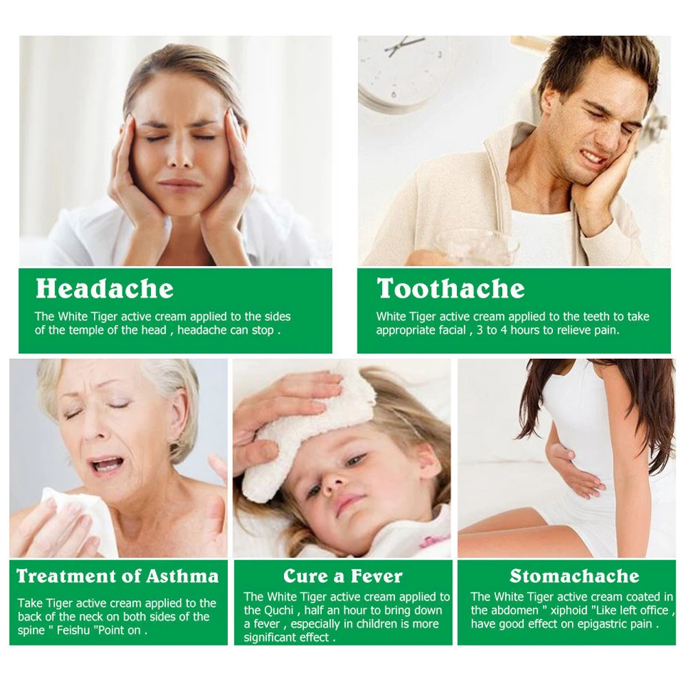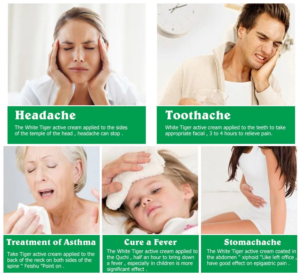 Зубная боль:Активный крем с белым тигром наносится на зубы, чтобы принять подходящий для лица, от 3 до 4 часов, чтобы облегчить боль.