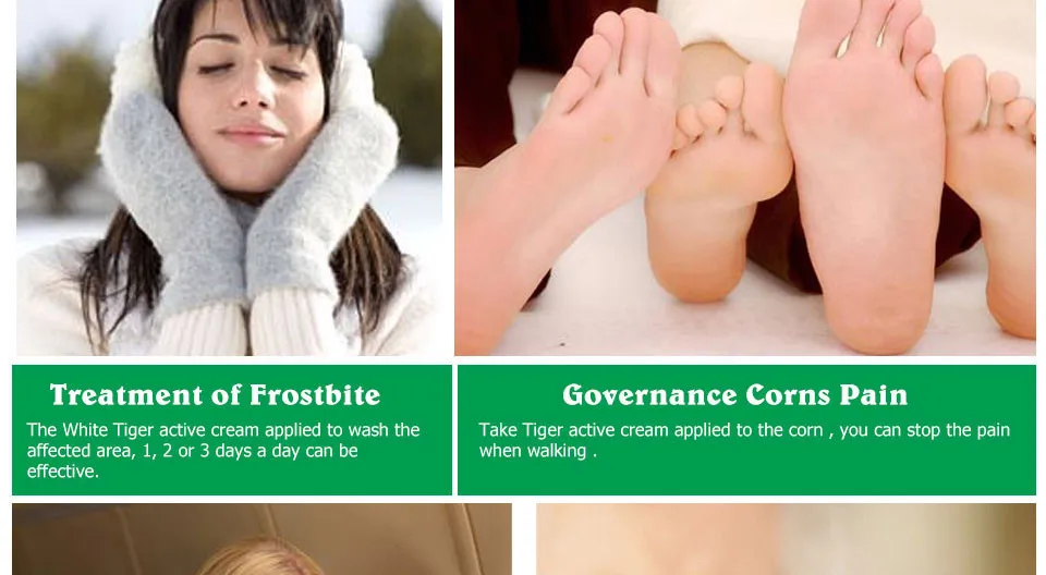 Лечение обморожения:Активный крем с белым тигром, применяемый для мытья пораженной области, 1, 2 или 3 дня в день может быть эффективным.