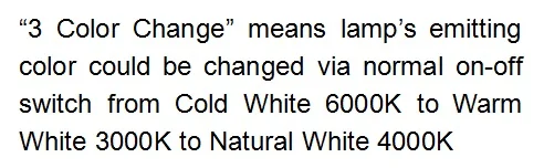 1.Вариант «3 изменения цвета» означает, что цвет может быть изменен с помощью обычного включения-выключения от холодного белого 6000K до теплого белого 3000K до натурального белого 4000K