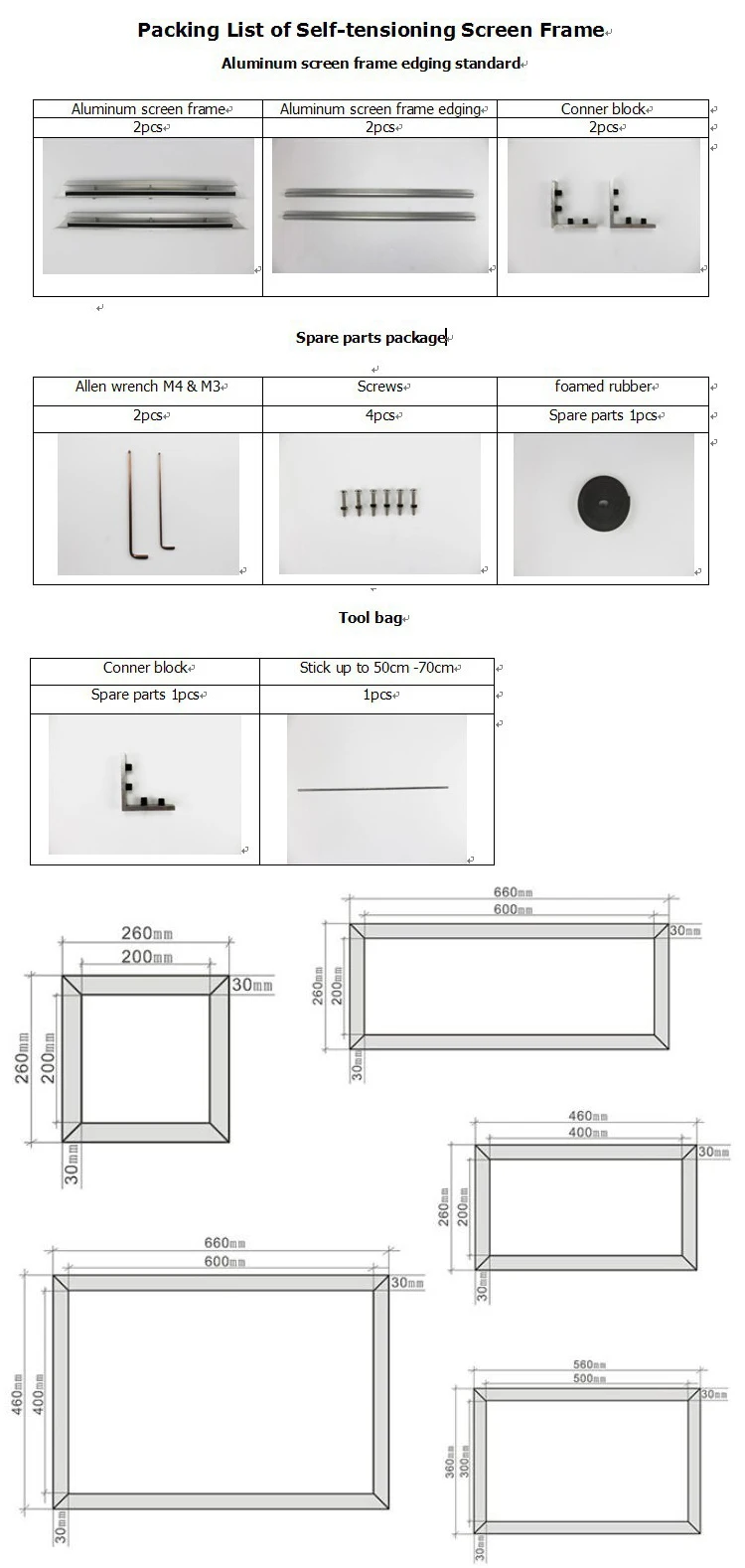 8. Для самостоятельного натяжения рамы экрана требуется только внутренний шестигранный ключ toM3 и M4, людям не нужно приобретать другие материалы и инструменты, которые могут быть из натяжения, изготовления пластин, печати, установка для сохранения сетки.