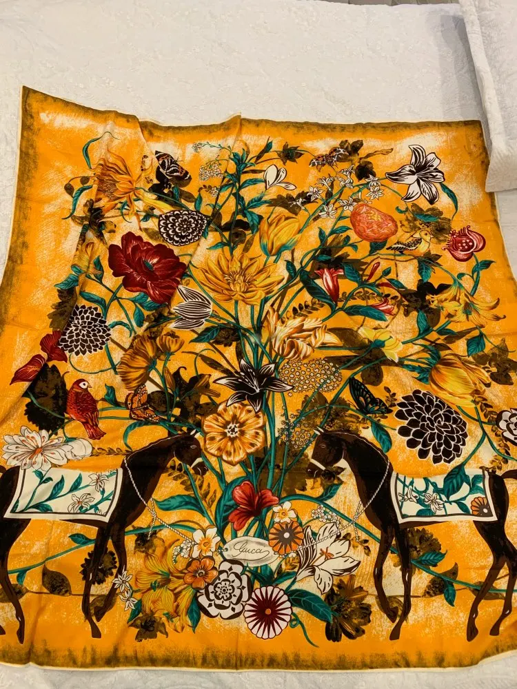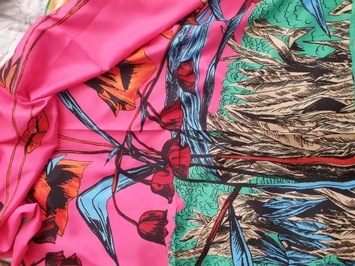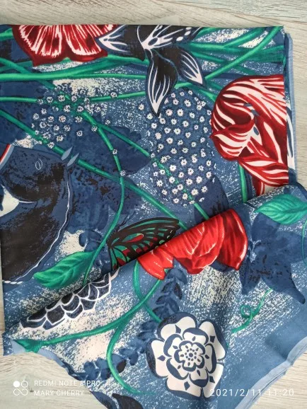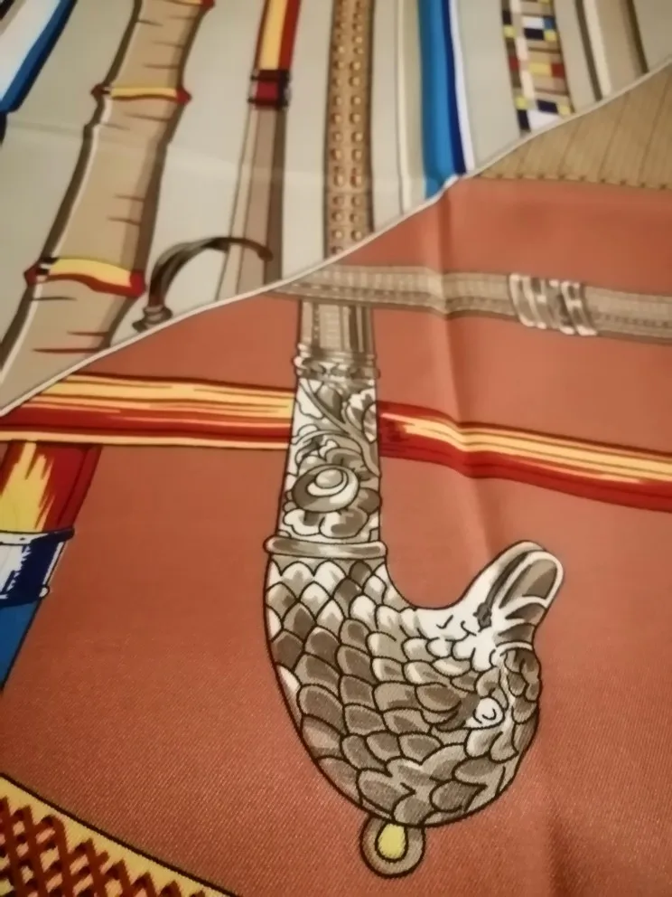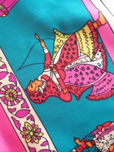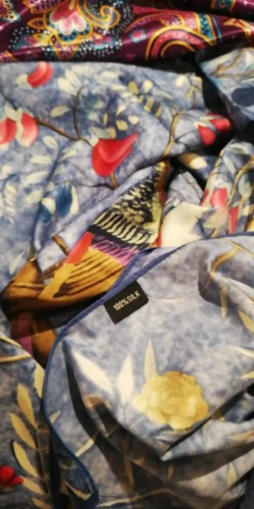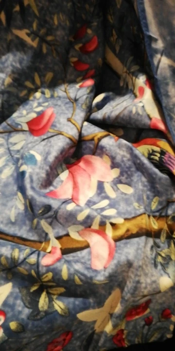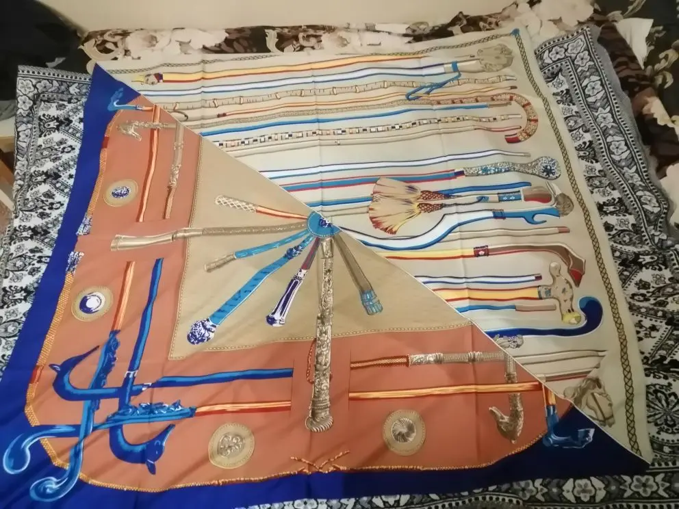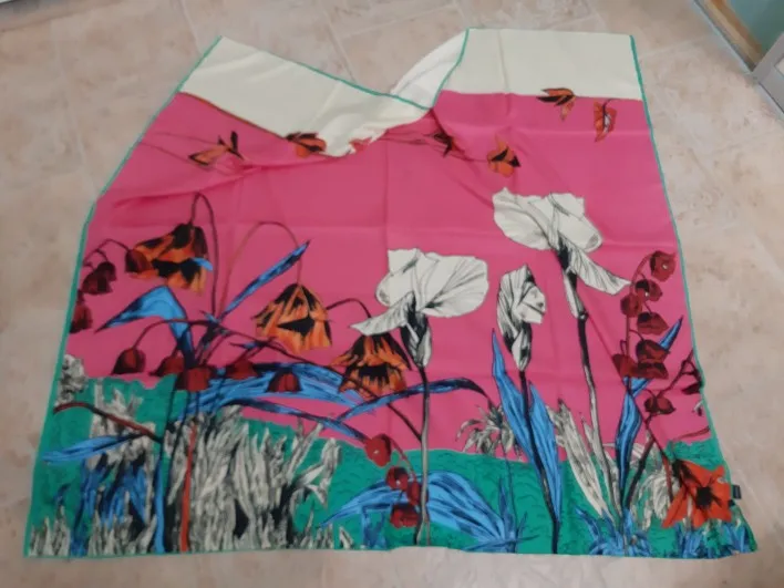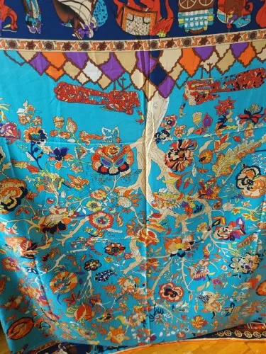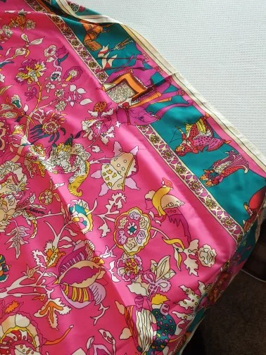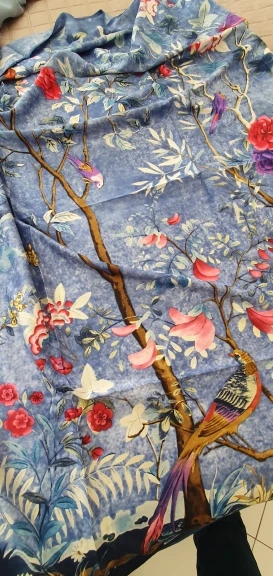 Как на изображении-цвета в основном бирюзовые, желтые, розовые. Принт немного не зарегистрирован, поэтому никто не подумает, что это такой бренд, как Hermes, но он все еще очень хорош. Ткань приятная на ощупь и шелковистая, но с корпусом, поэтому Красиво драпируется. Не мнется при ношении и мнется тусоваться ночью. Конечно хороший шарф. Изображение на двухместной кровати для справки по размерам с изображением одежды. Я быстро получил его в Лас-Вегасе, из-за пандемии спада почты. Куплю снова.