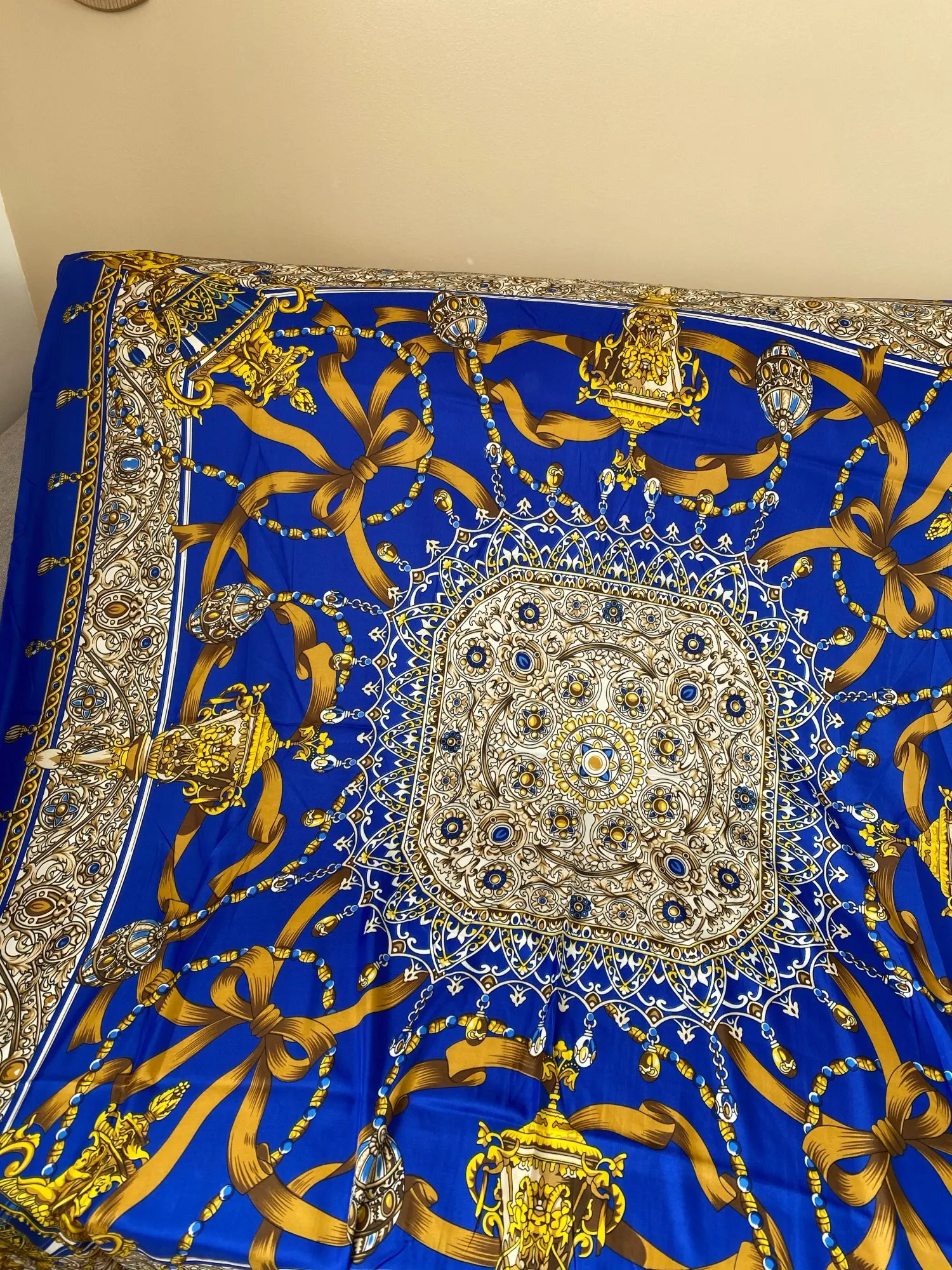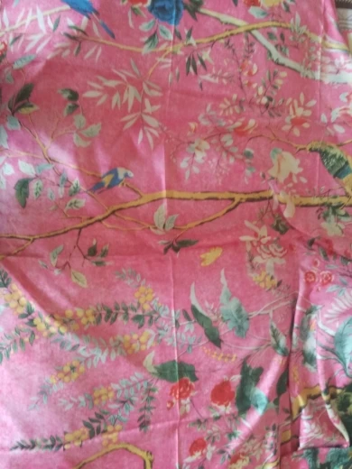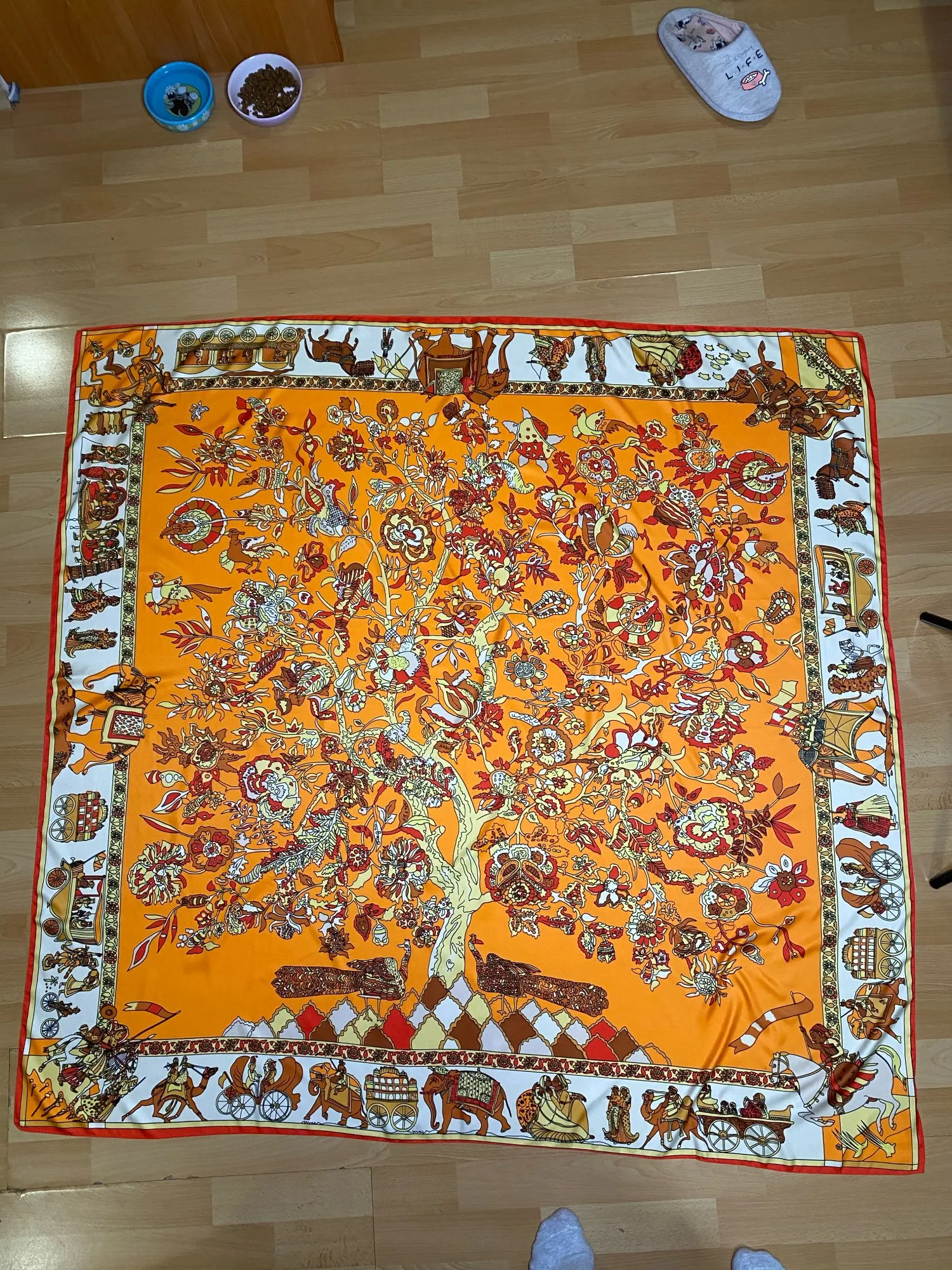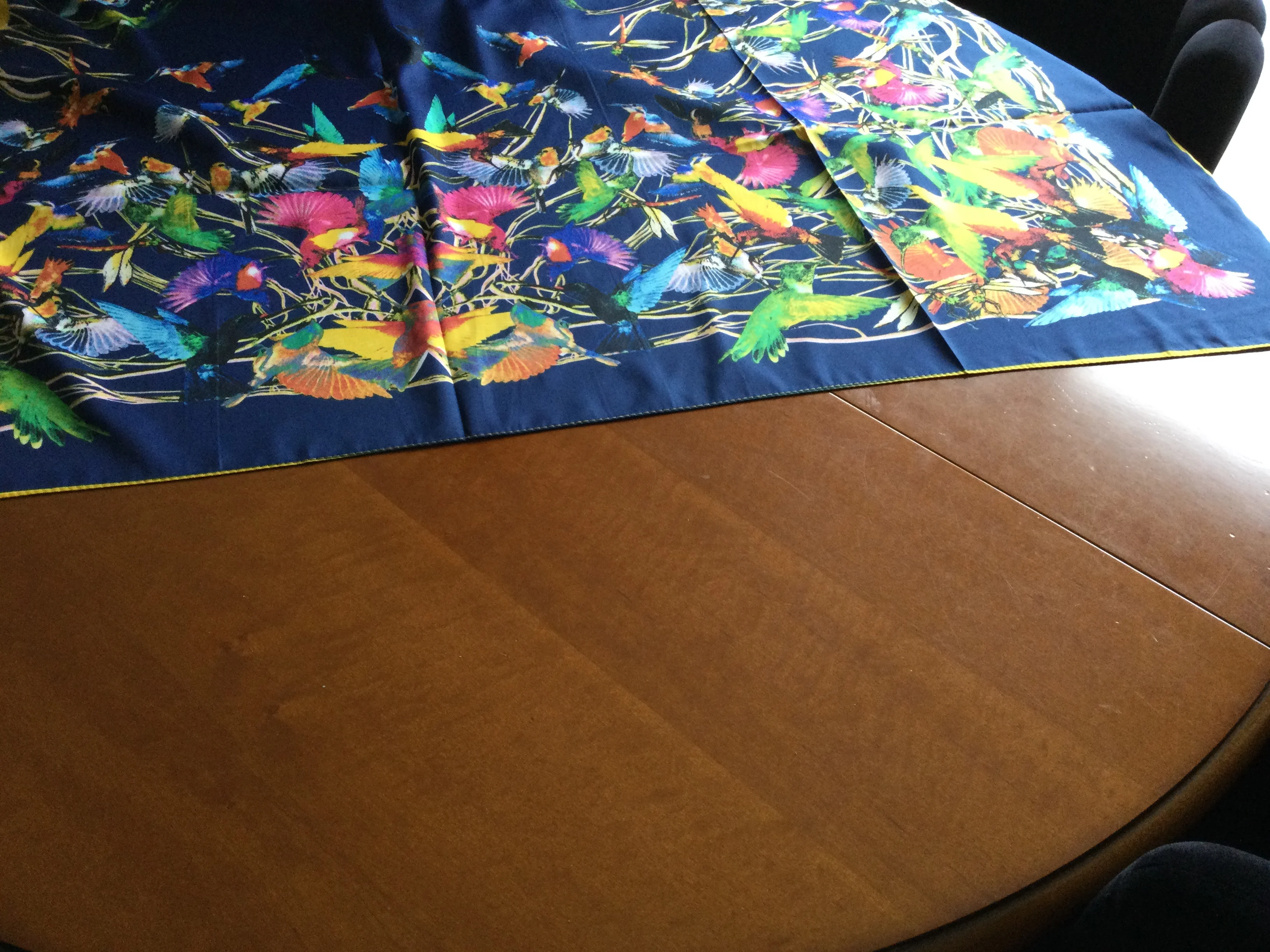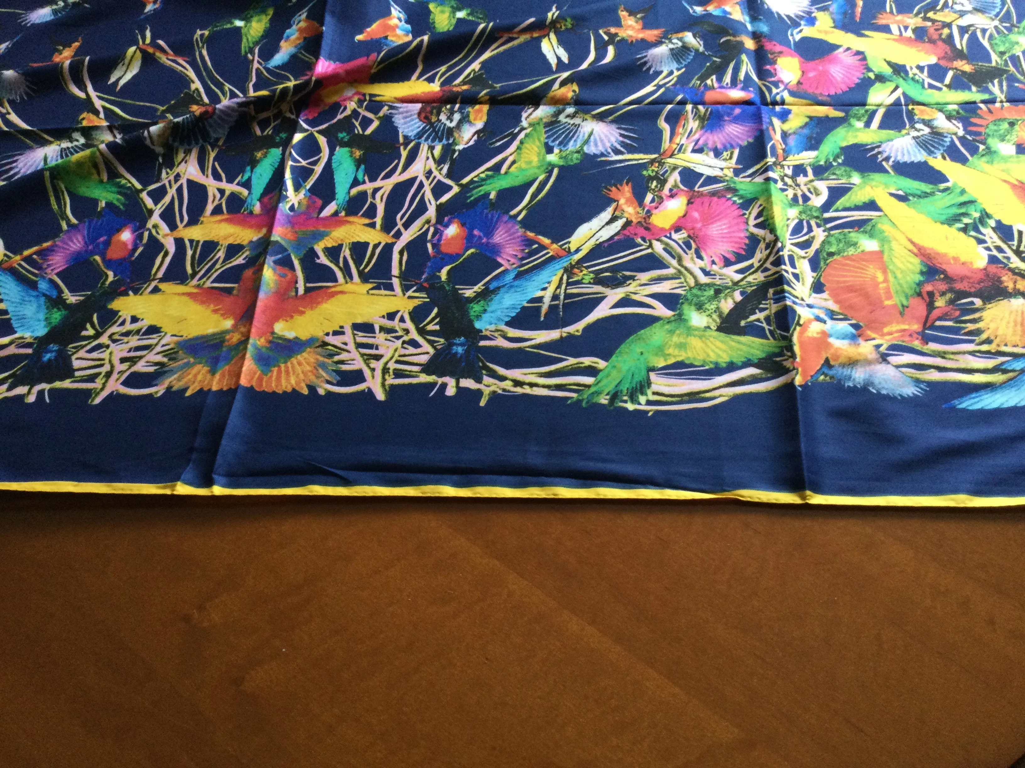 Как на изображении-цвета в основном бирюзовые, желтые, розовые. Принт немного не зарегистрирован, поэтому никто не подумает, что это такой бренд, как Hermes, но он все еще очень хорош. Ткань приятная на ощупь и шелковистая, но с корпусом, поэтому Красиво драпируется. Не мнется при ношении и мнется тусоваться ночью. Конечно хороший шарф. Изображение на двухместной кровати для справки по размерам с изображением одежды. Я быстро получил его в Лас-Вегасе, из-за пандемии спада почты. Куплю снова.