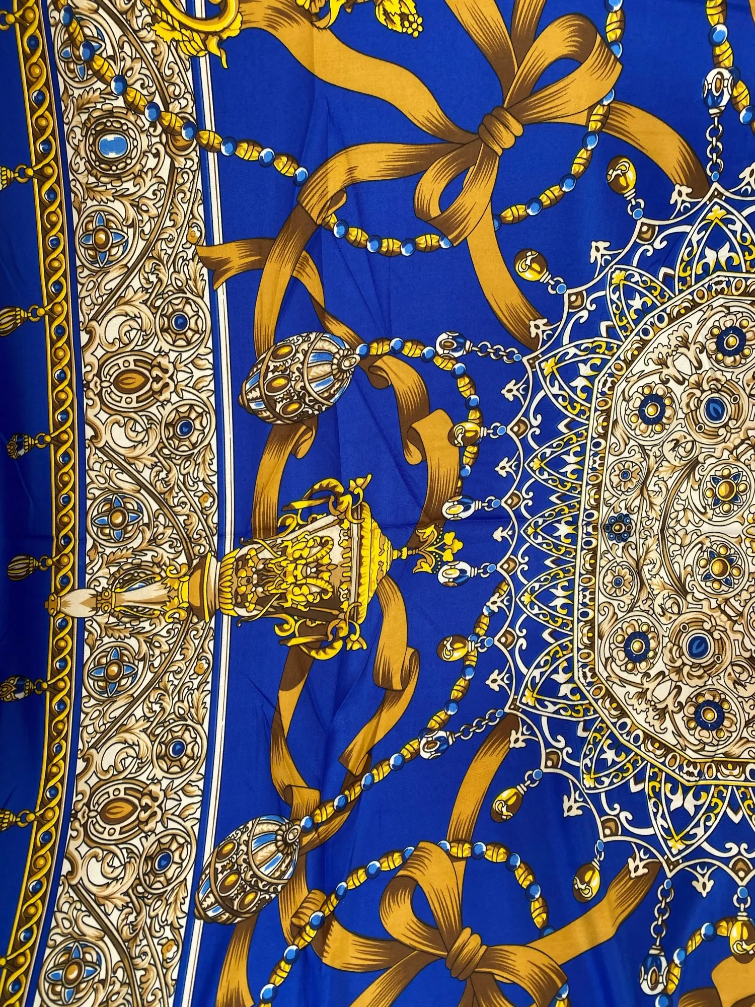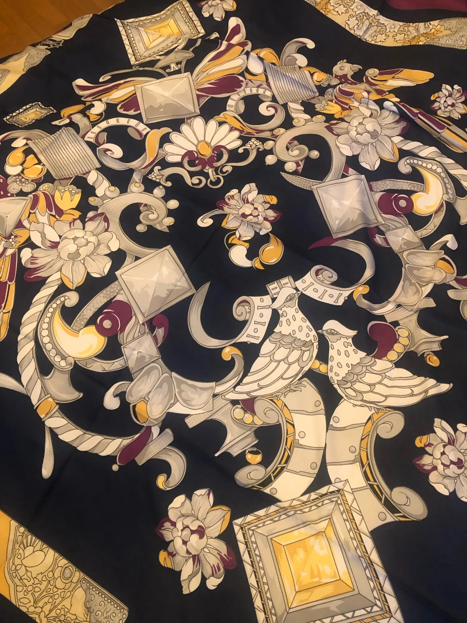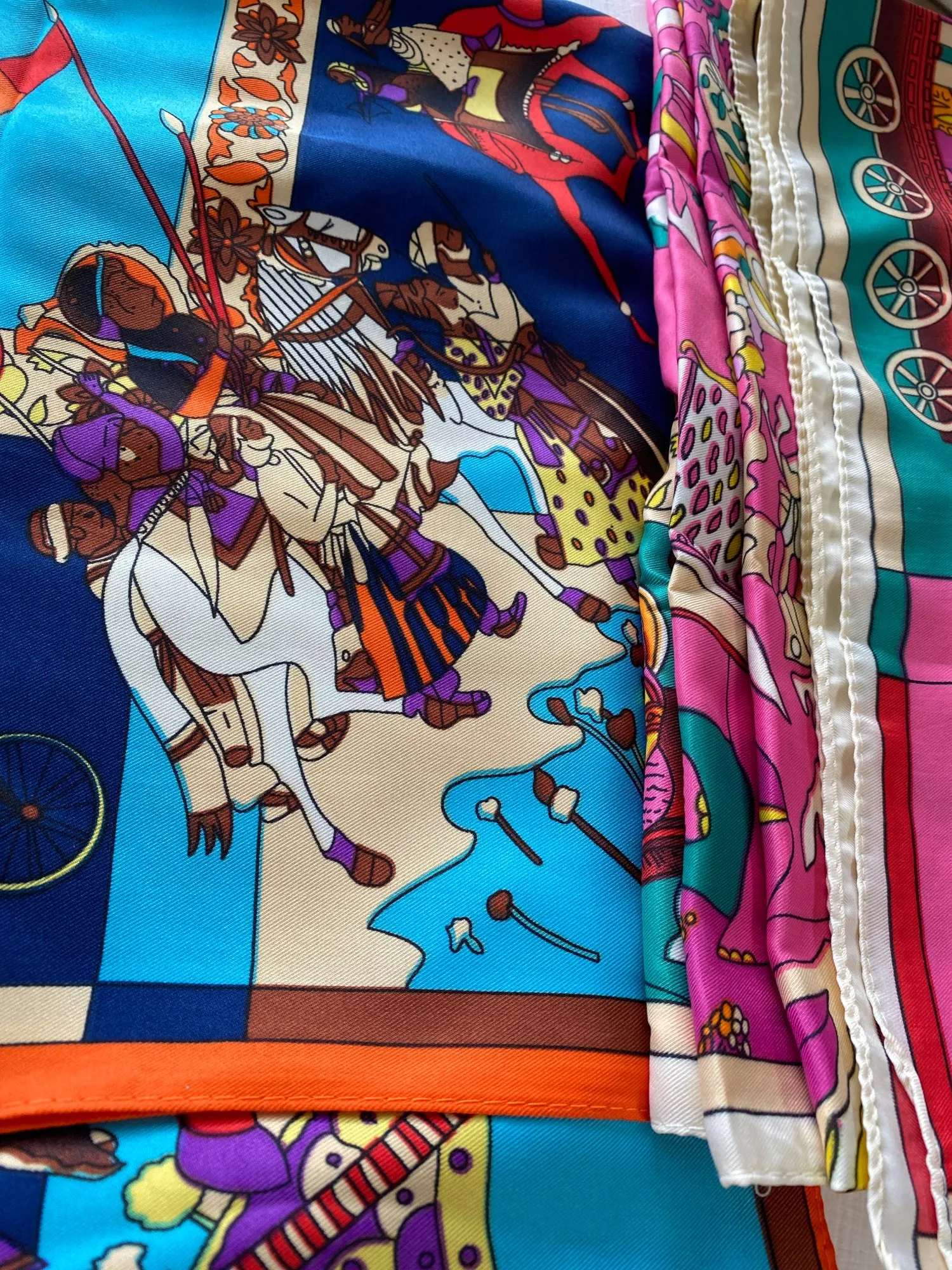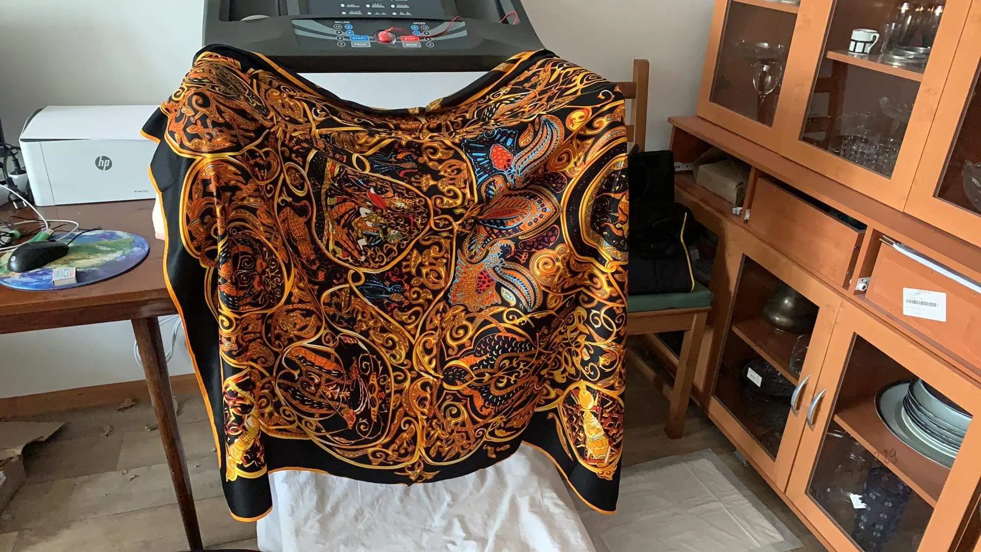 Как на изображении-цвета в основном бирюзовые, желтые, розовые. Принт немного не зарегистрирован, поэтому никто не подумает, что это такой бренд, как Hermes, но он все еще очень хорош. Ткань приятная на ощупь и шелковистая, но с корпусом, поэтому Красиво драпируется. Не мнется при ношении и мнется тусоваться ночью. Конечно хороший шарф. Изображение на двухместной кровати для справки по размерам с изображением одежды. Я быстро получил его в Лас-Вегасе, из-за пандемии спада почты. Куплю снова.