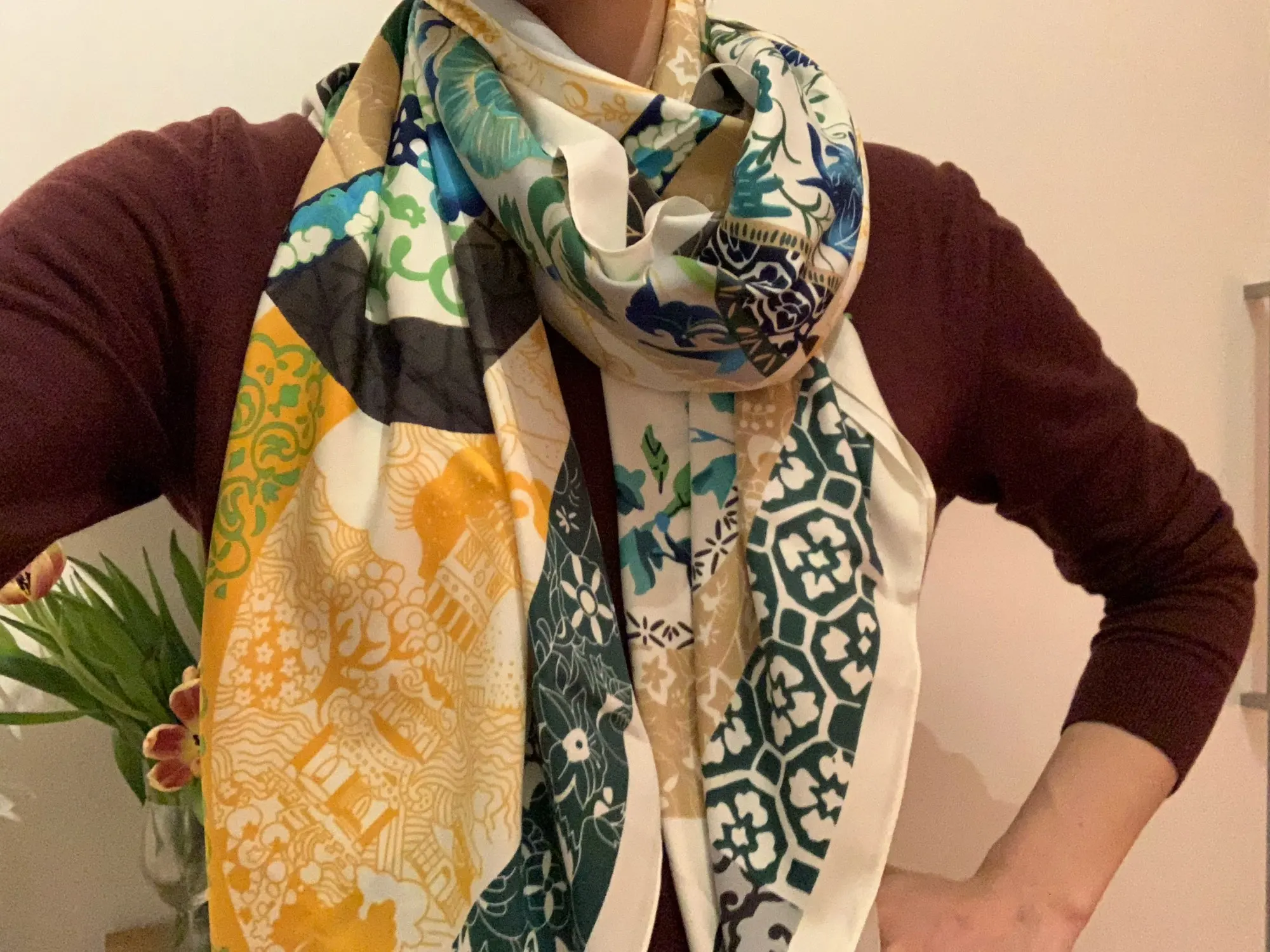 Очень красиво! Большое спасибо! Такая быстрая доставка и хорошее качество. Шарф огромный! Только шелк намного тоньше, чем я хотел бы, и шарф становится Электрифицированным. Но для этой цены это не критично, и, возможно, это только первый день. Спасибо!