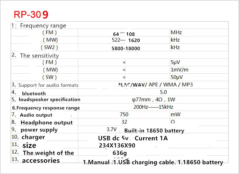 Портативный радиоприемник Tecsun RP-309 DSP цифровая Демодуляция, трехдиапазонный радиоприемник DSP, Bluetooth, колонка, TF-карта, U-диск, цифровой плеер
