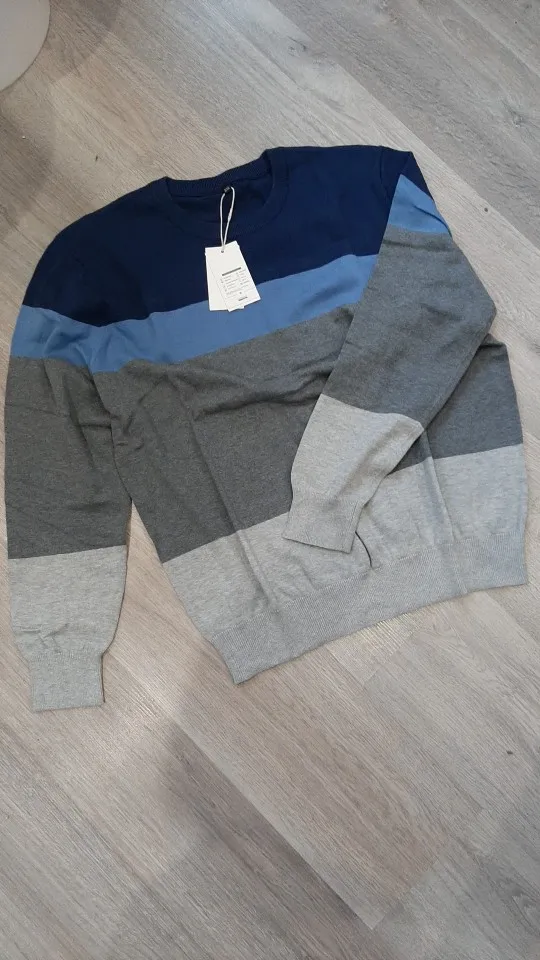 Трикотаж очень плотный, но тонкий. На ощупь похож на вискозу с синтетикой. Цвет свитера прислали другой, то есть чередование полос по цвету изменили. На фотографии было лучше,чем прислали.