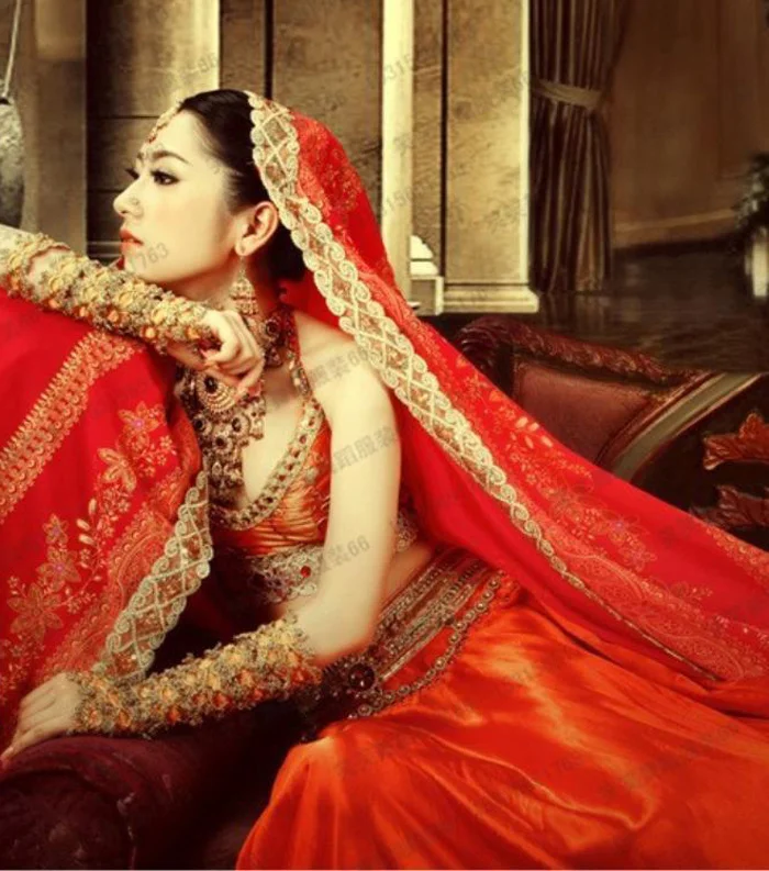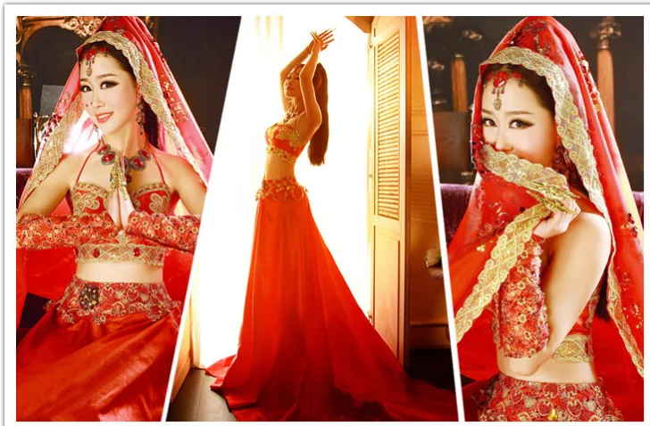 Комплект оранжевого цвета: обмотанная грудь и юбка оранжевого цвета, вуаль красного цвета