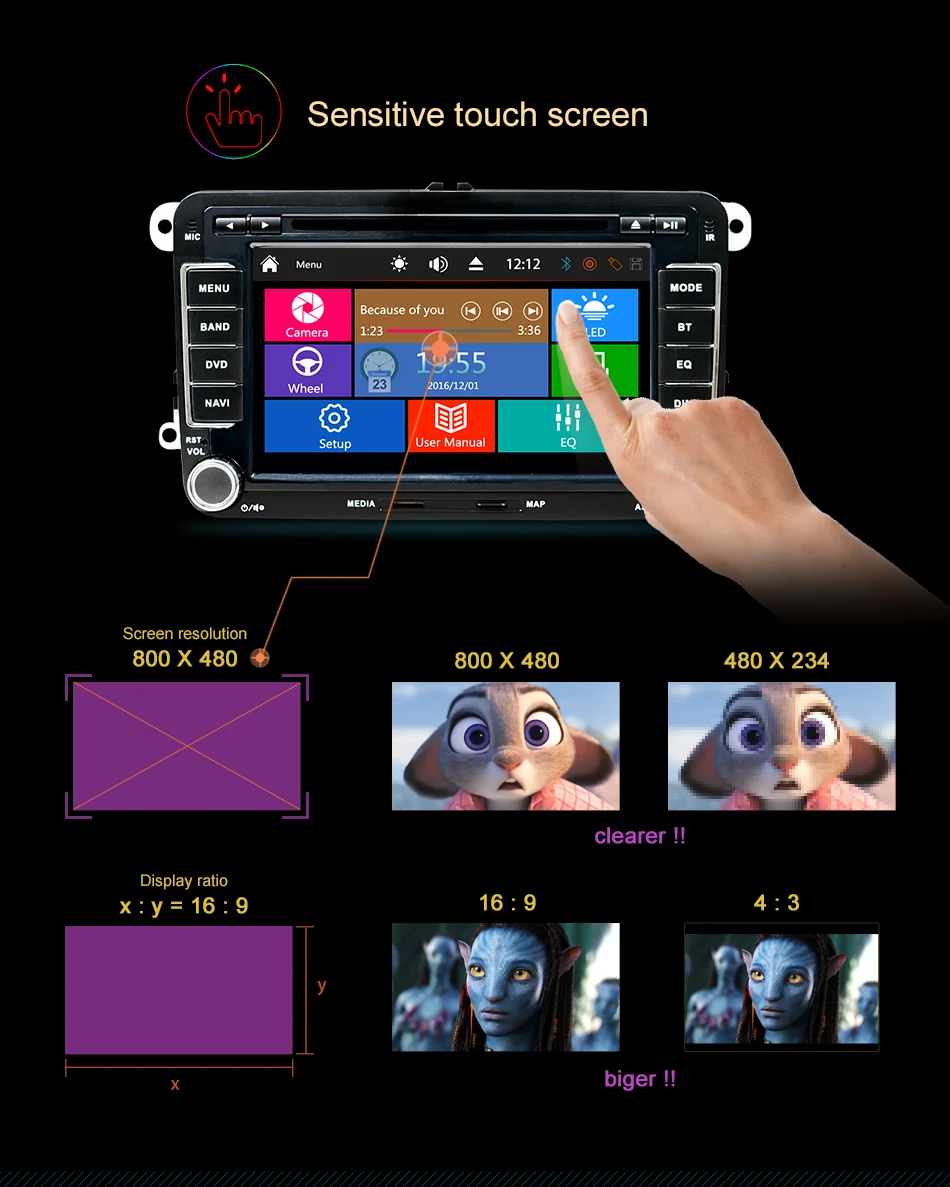 Технические параметрыTFT LCD с разрешением 800*480 высокой четкости.Оптимизированная Windows CE6.0Напряжение: 12 В постоянного токаТок: 30 мАВыходная мощность: 4*45 ВтFM частота: 87,5-108MH AM частота: 522-1710 кГц