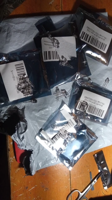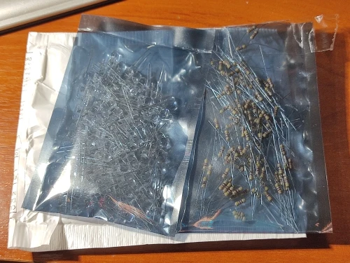 пришло 5 пакетов, в 4-х диоды двух видов, в 5-м резисторы... ещё не проверял... упакованы в стандартную "пупырку")