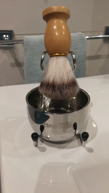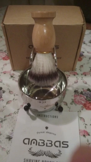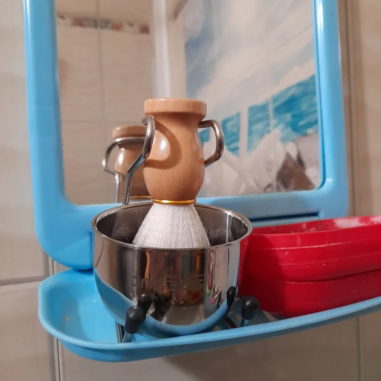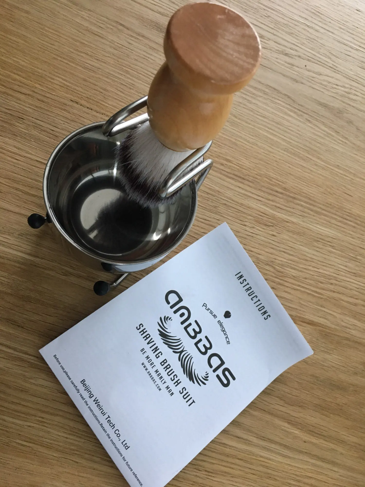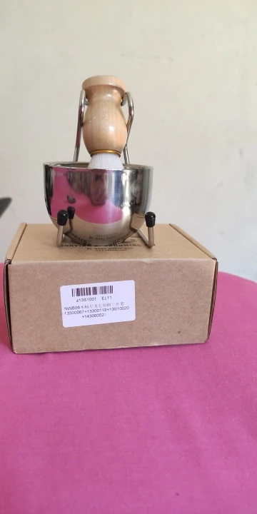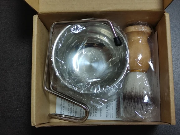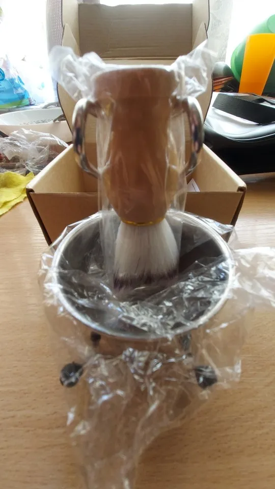 Шло 3 недели в Украину. Что получаем по факту: чашка, подставка, помазок. Помазок - простейшая синтетика, но пену взбивает неплохо, сам ворс средней жёсткости, раздражения на лице не оставляет. После распаковки вымачивал помазок как в кипятке, так и сутки в холодной воде в холодильнике - ворс не выпадает. Чаша - качество относительное, вся в коцках и с пошкрябанной краской. Но - за эти деньги устраивает более чем. Это моя первая чаша на пробу, если пойму что мокрое бритье моё, дальше закажу чашу побольше и поудобнее, так как эта мелка, в руке держать не очень удобно. Подставка - отличная, тут без претензий. Короче, за эти деньги, можете брать смело, если вам абсолютно пофиг на бренды, или если вы как я новичок, и хотите понять, стоит ли оно всех этих заморочек. В принципе продавцу ставлю 5 баллов, приехало все целое, отправил быстро.