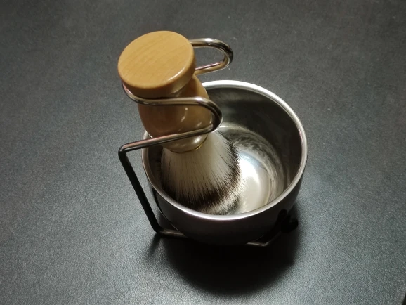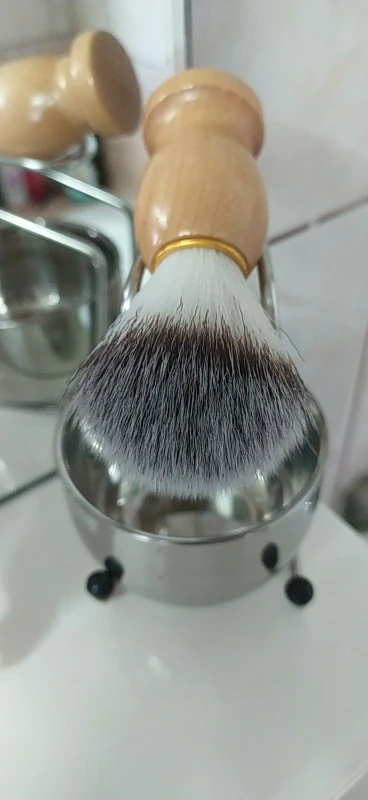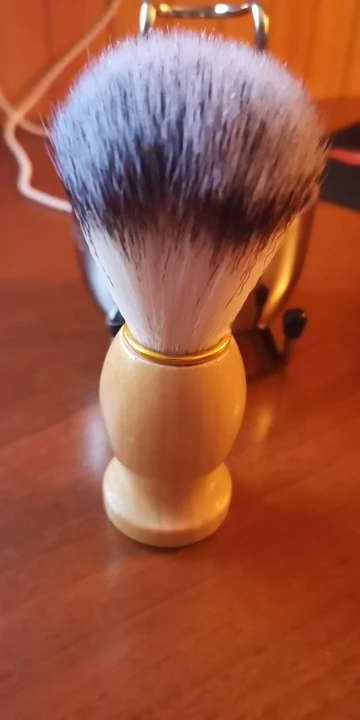 Синтетический мягкий помазок, лицо не колет, волос не выпадает. Ручка из дерева, покрыта чем-то вроде лака, водоустойчива. Пена взбивается легко даже из обычного мыла. Все вместе с подставкой занимает мало места. Я очень доволен