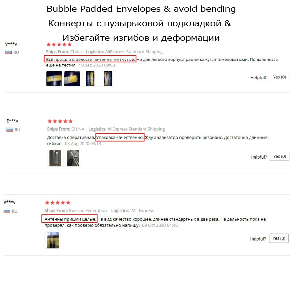 Быстрая отправка и доставка. Антенны работают нормально, лучше штатных. Гибкие и немного большим диаметром, чем более дорогие тайваньские Нагоя 771. Это слегка улучшает характеристики антенны. По коэффициенту усилению мало им уступают. При такой цене этим можно пренебречь. Увеличивают дальность радиосвязи. Рекомендую, не пожалеете.