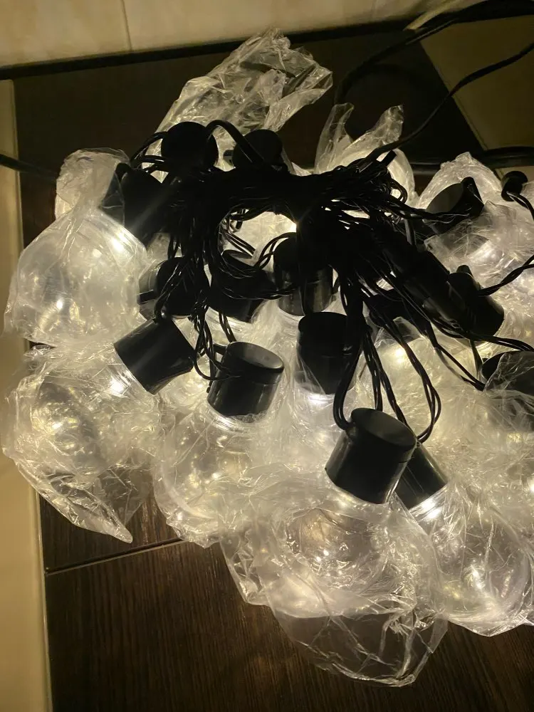 Нити из теплых белых светодиодов, заключенных в прозрачные глобусы G45 вдоль черного шнура