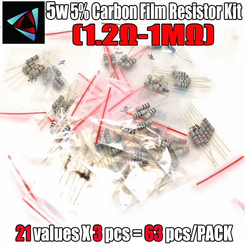 63 шт.лот 5 Вт 5% 1.2R-1 м 21 значение * 3 шт. резистор из углеродной пленки, обычно комплекты из оксида металла