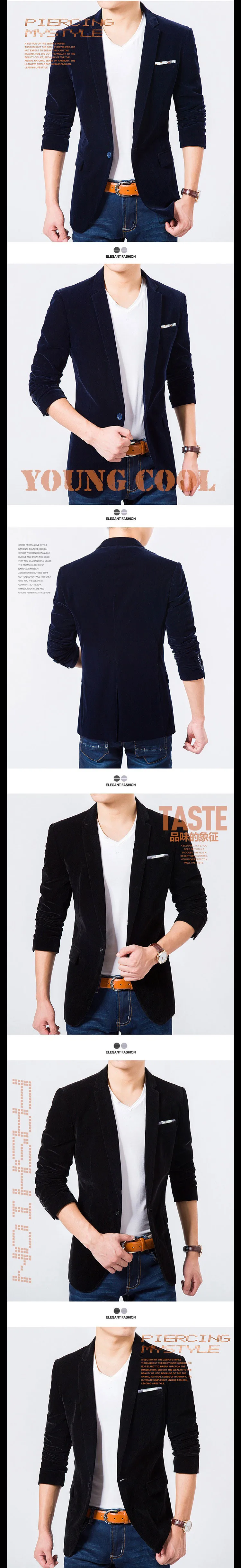 Высокое качество из бархата ярко-синего цвета, пиджак для мужчин новая осенняя коллекция одежды в Корейском стиле, модный Мужской приталенный, с одной пуговицей костюм с пиджаком свадебный пиджак