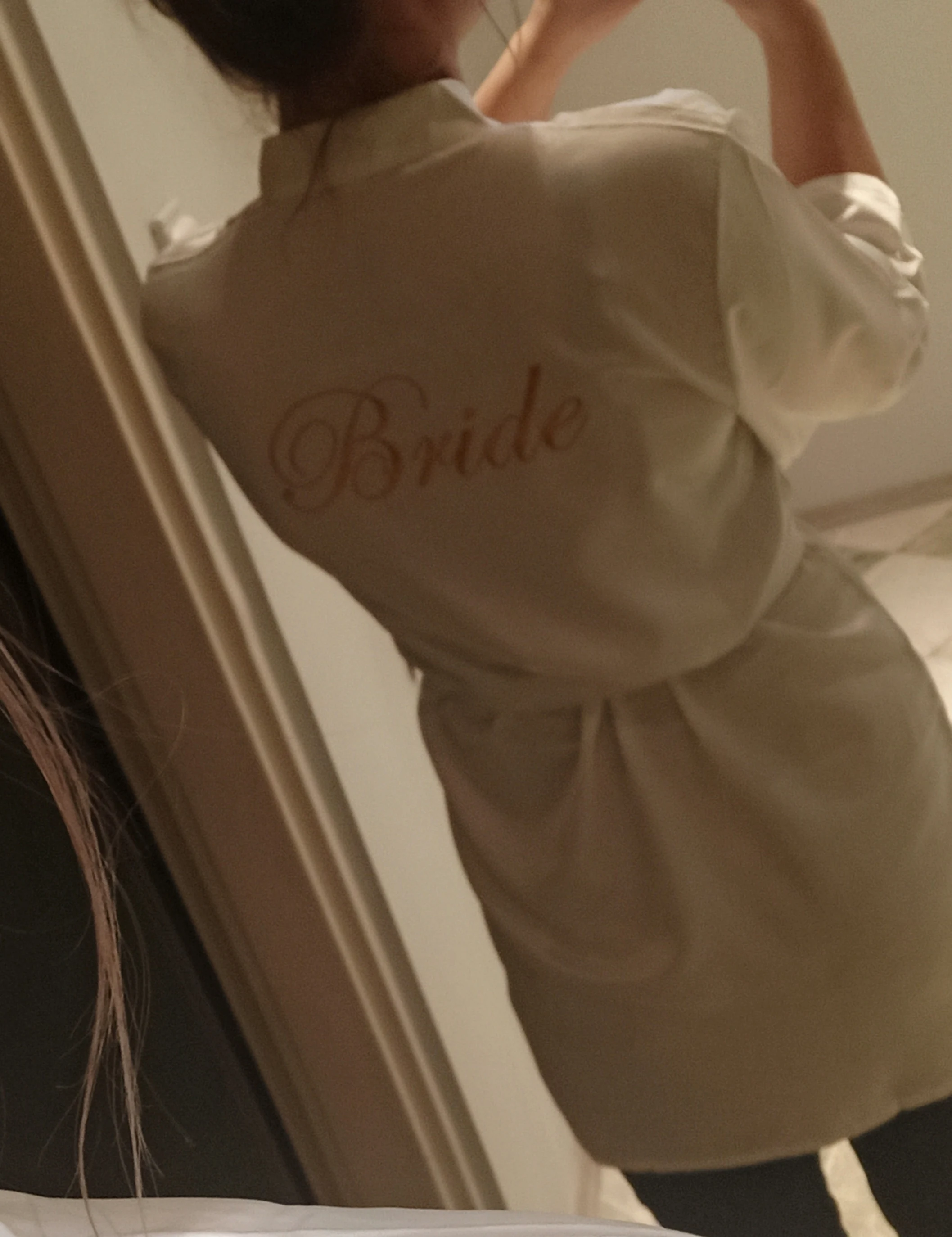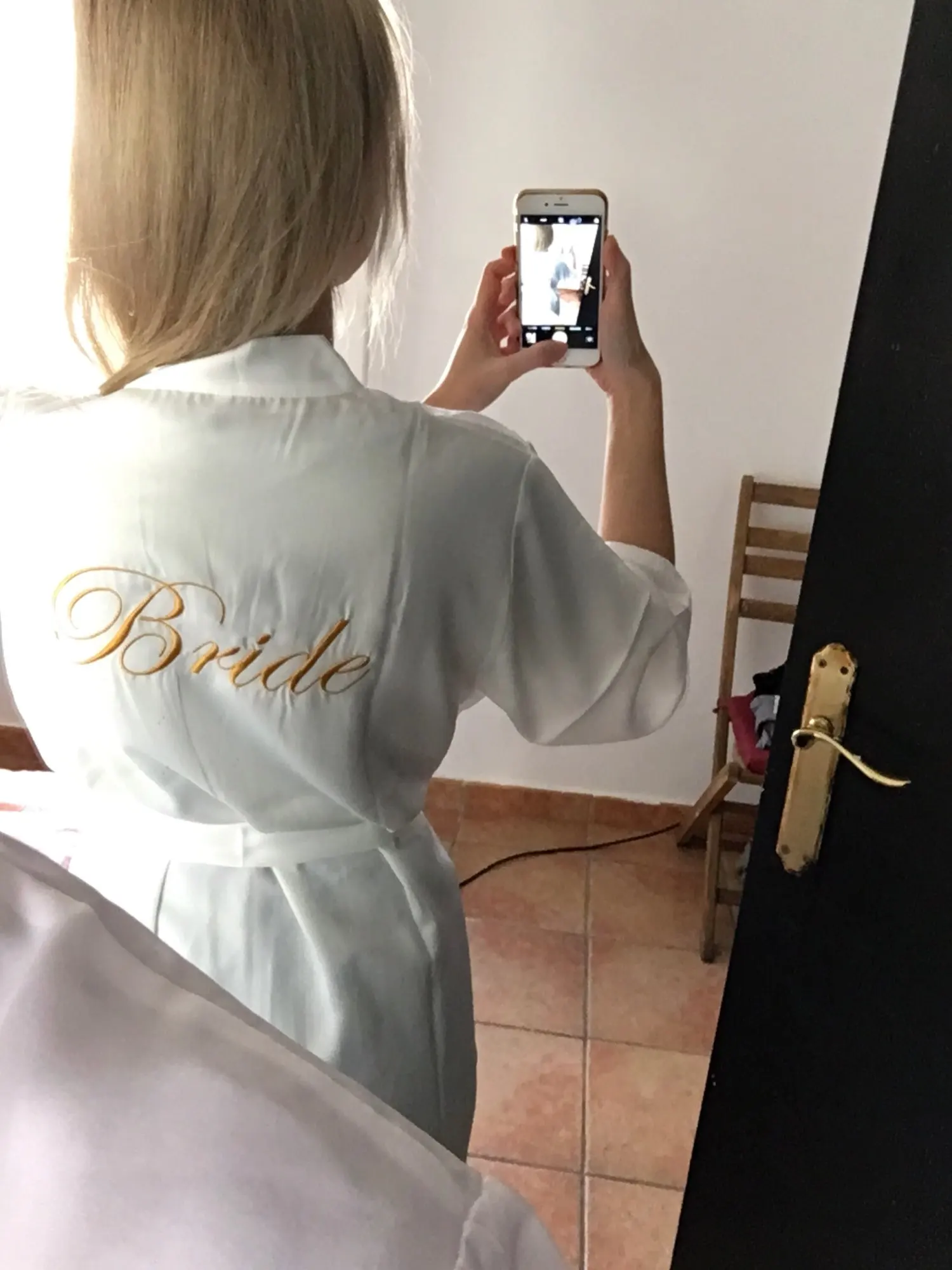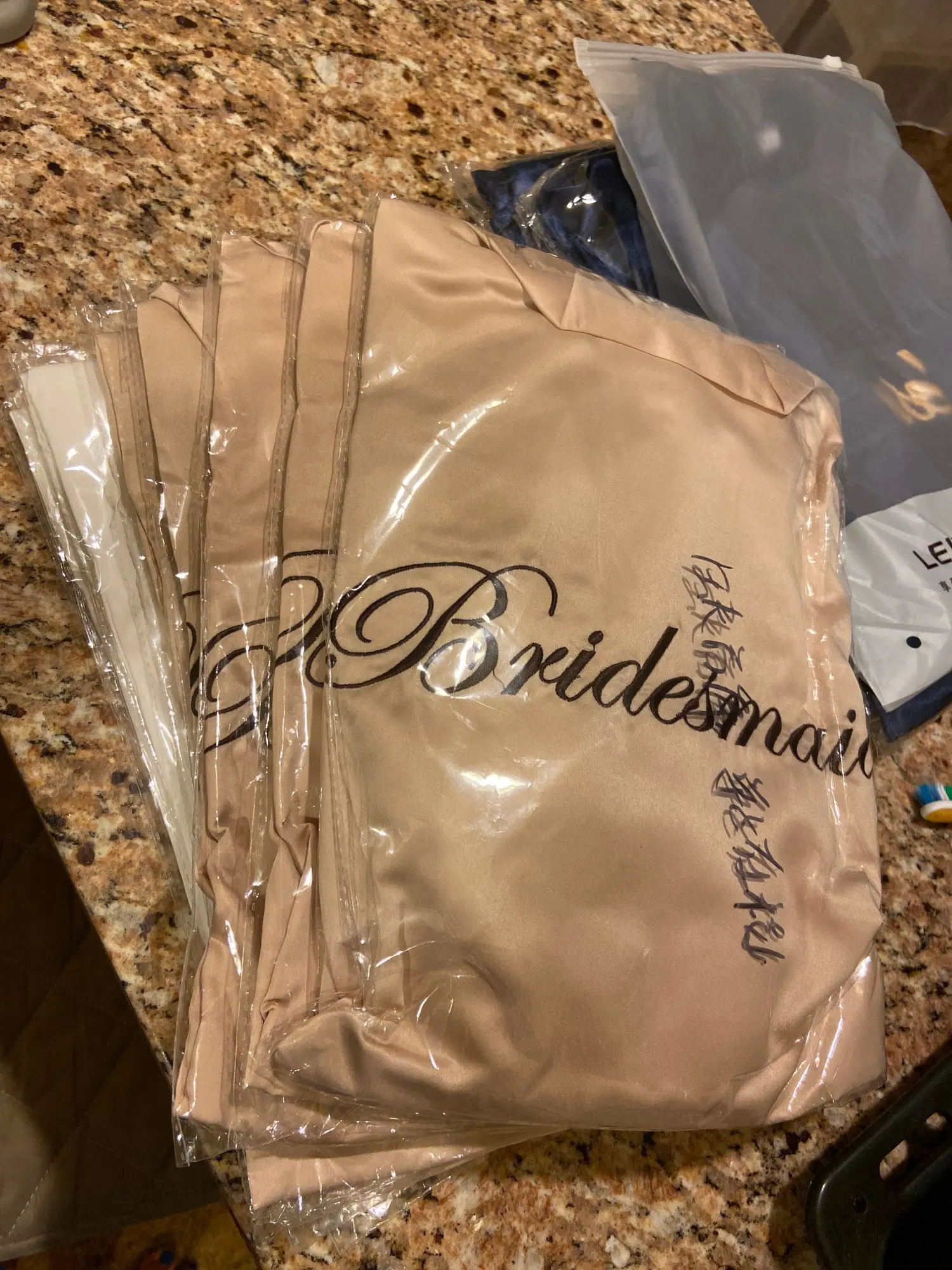 Быстрая доставка. Меньше месяца. Заказала для девичника всем размер L. Можно было взять и меньше, но побоялась, что будет короткий очень халат. Длина - выше колена, достаточно тонкая ткань, вышивка аккуратная, запаха нет. Нужно будет антистатиком все обработать