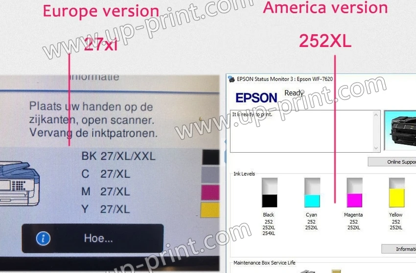 В разных областях используются различные модели чернильных картриджей, хотя модель принтера одинаковая! Если ваш оригинальный номер картриджа 27 /27XL, пожалуйста, выберите Европейский вариант чернил 27XL Если ваш оригинальный номер картриджа 252 /252XL, пожалуйста, выберите американский вариант 252XL